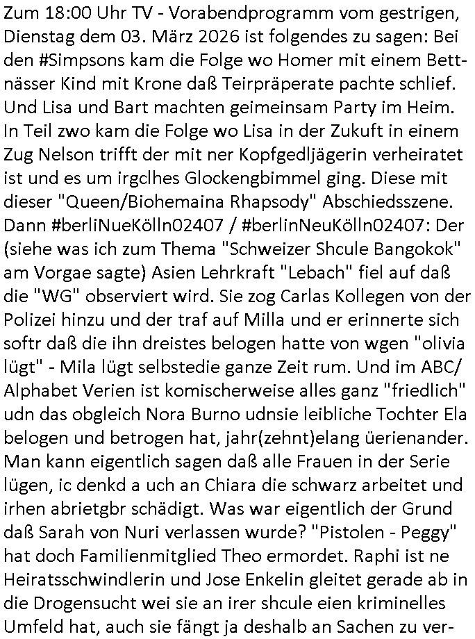 | Zum 18:00 Uhr TV - Vorabendprogramm vom gestrigen, Dienstag dem 03. März 2026 ist folgendes zu sagen: Bei den #Simpsons kam die Folge wo Homer mit einem Bett- nässer Kind mit Krone daß Teirpräperate pachte schlief. Und Lisa und Bart machten geimeinsam Party im Heim. In Teil zwo kam die Folge wo Lisa in der Zukuft in einem Zug Nelson trifft der mit ner Kopfgedljägerin verheiratet ist und es um irgclhes Glockengbimmel ging. Diese mit dieser "Queen/Biohemaina Rhapsody" Abschiedsszene. Dann #berliNueKölln02407 / #berlinNeuKölln02407: Der (siehe was ich zum Thema "Schweizer Shcule Bangokok" am Vorgae sagte) Asien Lehrkraft "Lebach" fiel auf daß die "WG" observiert wird. Sie zog Carlas Kollegen von der Polizei hinzu und der traf auf Milla und er erinnerte sich softr daß die ihn dreistes belogen hatte von wgen "olivialügt" - Mila lügt selbstedie ganze Zeit rum. Und im ABC/ Alphabet Verien ist komischerweise alles ganz "friedlich" udn das obgleich Nora Burno udnsie leibliche Tochter Ela belogen und betrogen hat, jahr(zehnt)elang üerienander. Man kann eigentlich sagen daß alle Frauen in der Serie lügen, ic denkd a uch an Chiara die schwarz arbeitet und irhen abrietgbr schädigt. Was war eigentlich der Grund daß Sarah von Nuri verlassen wurde? "Pistolen - Peggy" hat doch Familienmitglied Theo ermordet. Raphi ist ne Heiratsschwindlerin und Jose Enkelin gleitet gerade ab in die Drogensucht wei sie an irer shcule eien kriminelles Umfeld hat, auch sie fängt ja deshalb an Sachen zu ver-