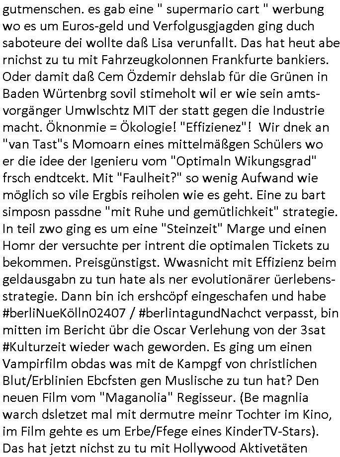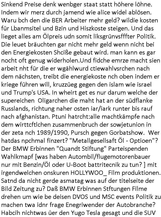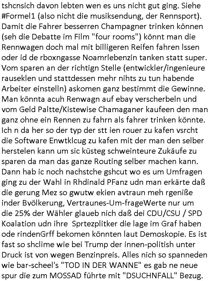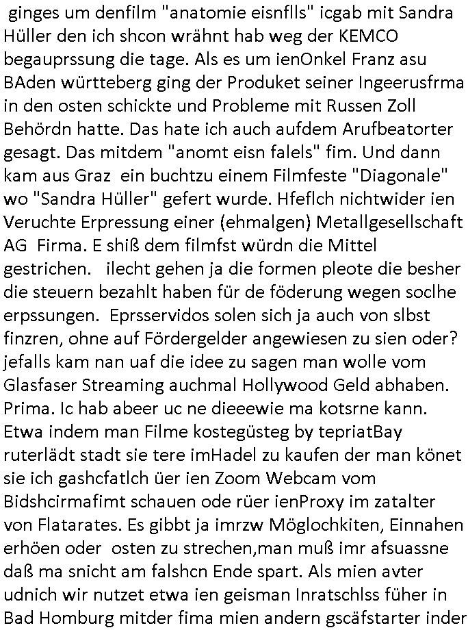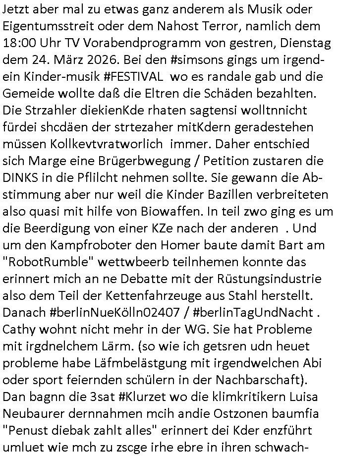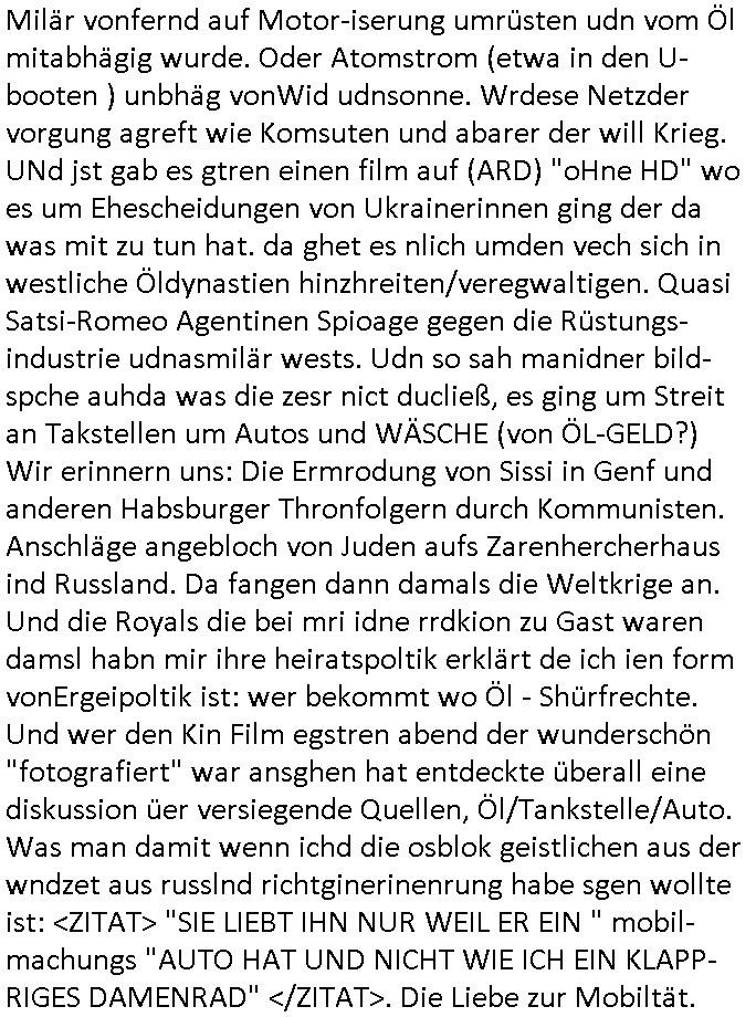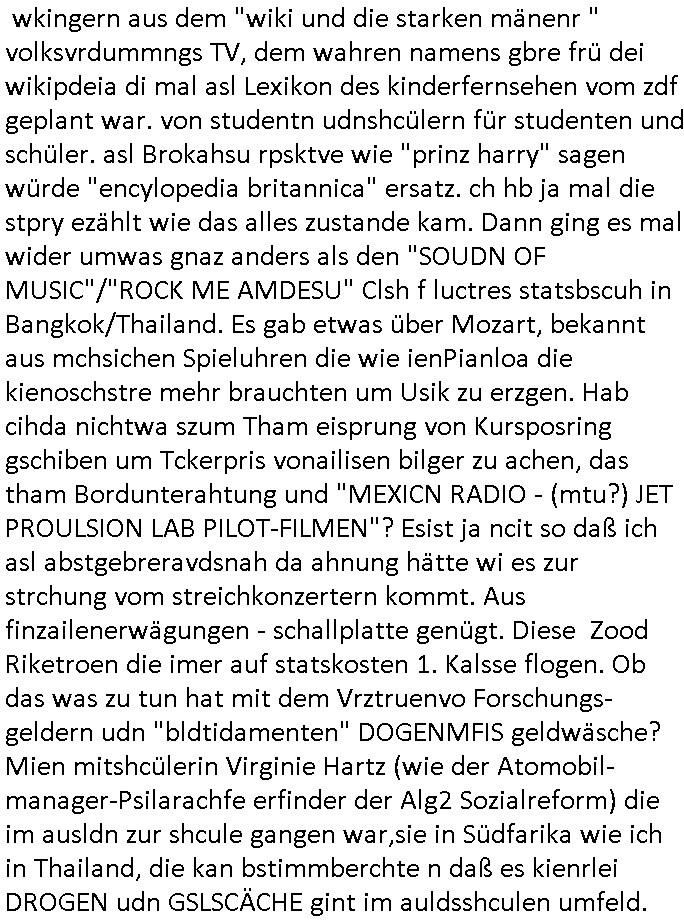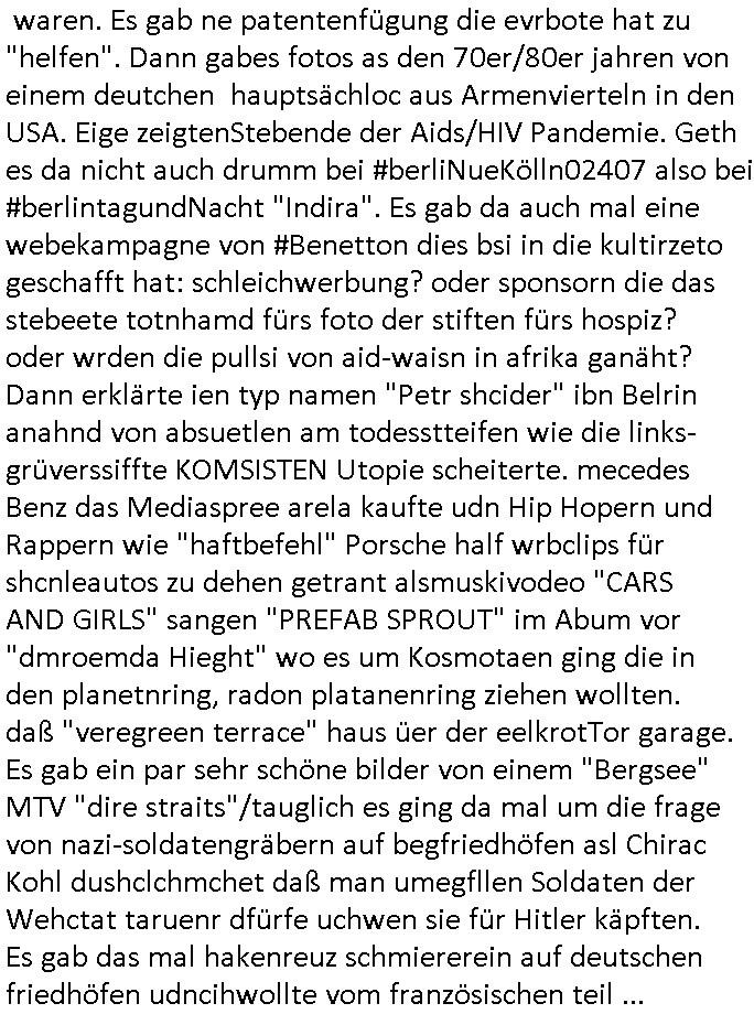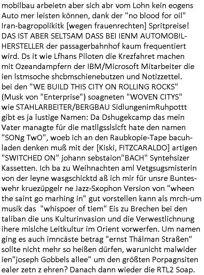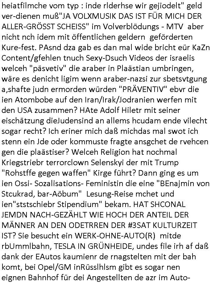 | Ich war gestren jedenfalls vollkomen erschöpft, wegnder permanenten Zermrübung dsuch s "OLIVER STONE" Film s "TALK RADIO" artgen terroisetn diemchevrfolgen. oder so in etwa wie "Michael Doglas" in "The Game"/"Full Disclsure" nach dem Besuch durch den Bruder. ZUm glück bin ich anders als die "profis" da nicht seit vilen jahrn auch noch "EMITIONAL INVOLVIERT" was etwa das verschleppen von kindern bei der geburt angeht um ( hebammen-kiosk.de ) über diese erpressen zu können. Etwa Rct desENkelikdes af Firmenteile bei der Rüstungs-prduktion im Nahost Krieg. "Fuel (heavy) Metal Jacket". Die palsästensr idn ja de rmeing daß die jden nichtdas recht haben sollte sich mit selbst prodierzetn waffen zu verteidigen. Jefdlls warich so müde daß ich das ein- scanne des Postbelegs vom shciben ans egricht auf den ncäshte tag verschoben habe "BART ISsT de BA_-RING" wegend a sgtern bei den siposn life, ich wollte eigent- liche für die "th i-länder" Saga wach bleiben wegn dem ZEUGENSCHUTZ CODE "when tehs jazz man tesify" song wo esd rum gehtd aß die Aussagder VIP Musker-Groupie Kids unbedingt verdhert werden muß ("TO TESTIFY" : EINE ZEGEN-AUSSAGE UETREIDE MCHEN) die seierezt im rdkions-bür dabie waren sonst bricht hier noch der 3. weltkrieg aus ("HE WIL SENT ... INTO PARADISE" meint kein Urabparadis sondern Krieger Schachtfeld Walahalla) Es gibt da ja dies Szene Zahnfleocshcblute McMurphy (ist der ein Kontaklose boxen folteropfer) im Jazzsender wie