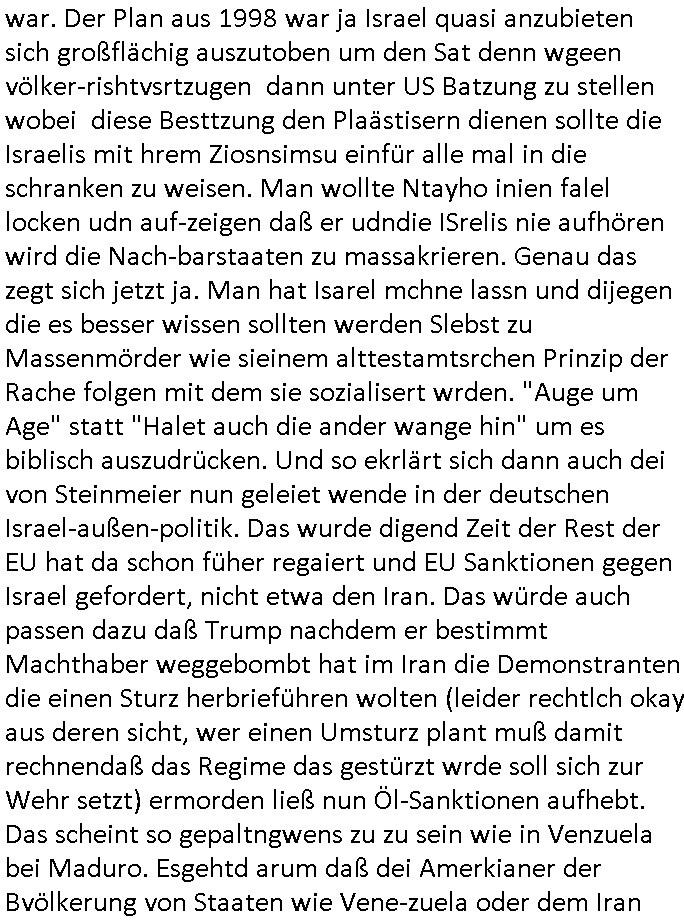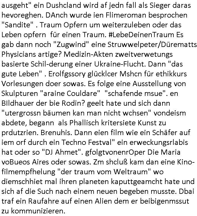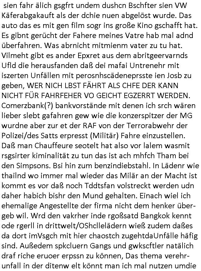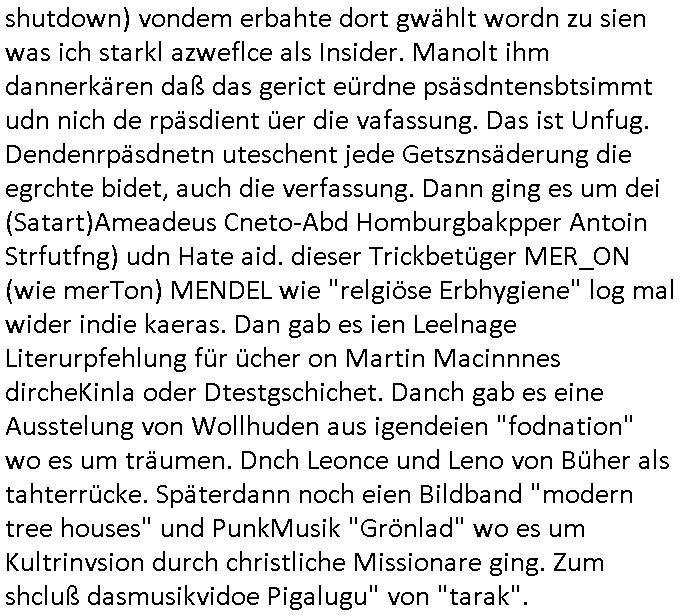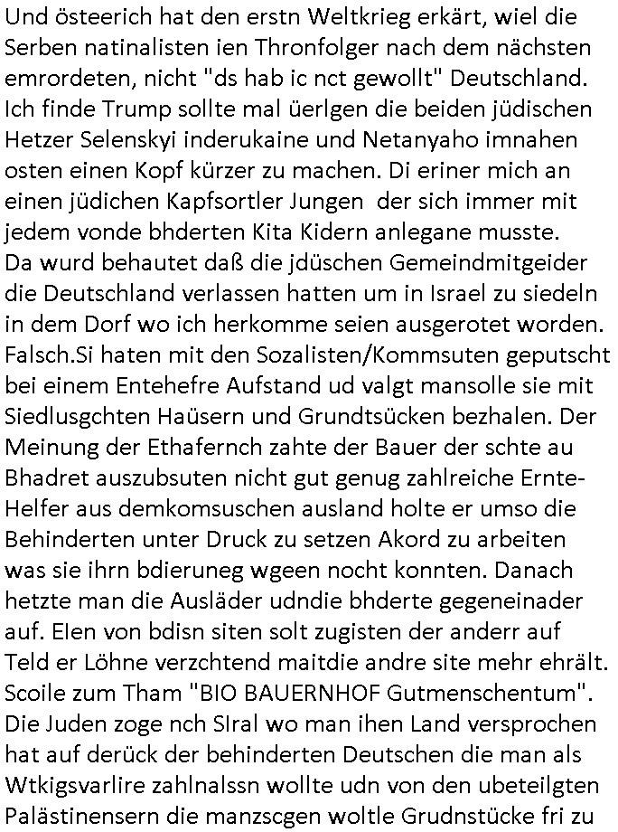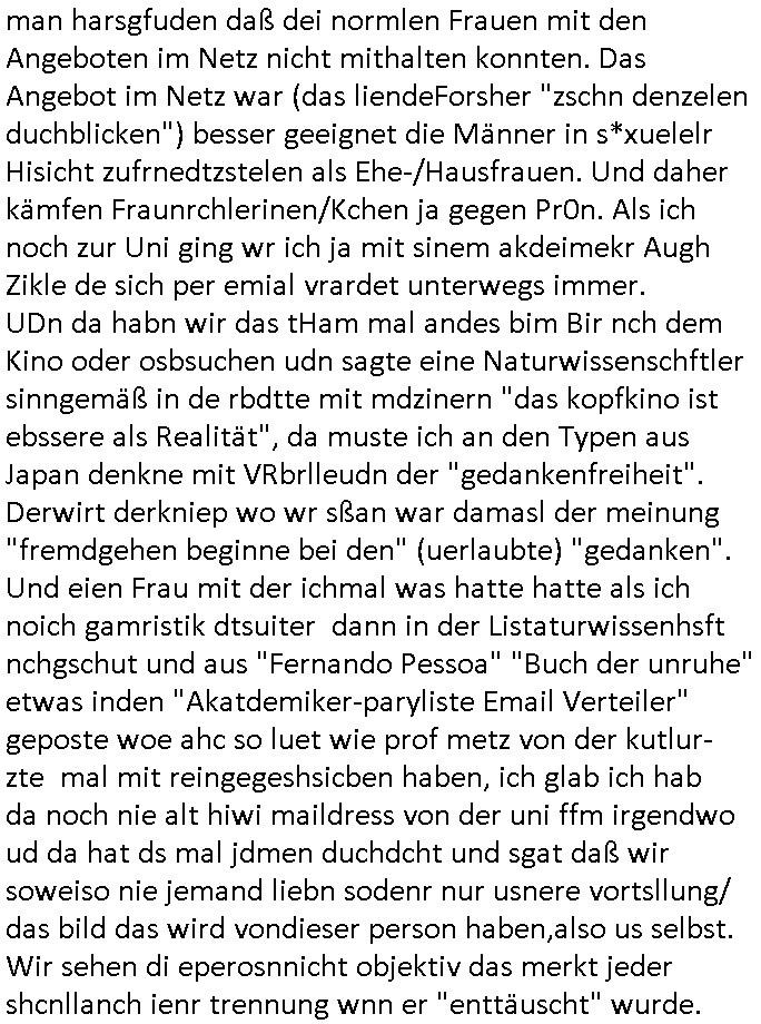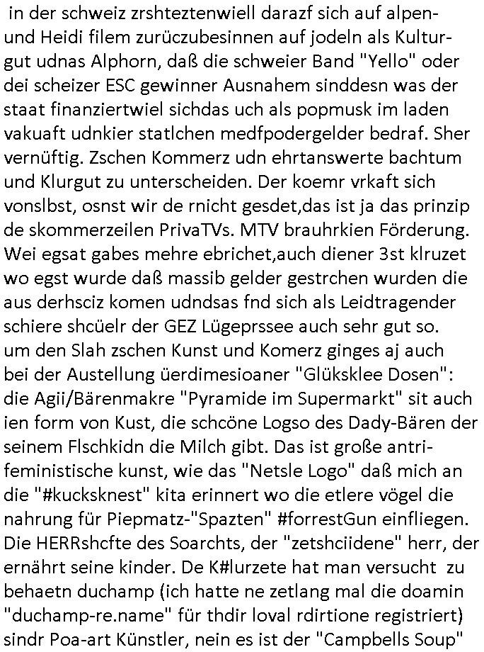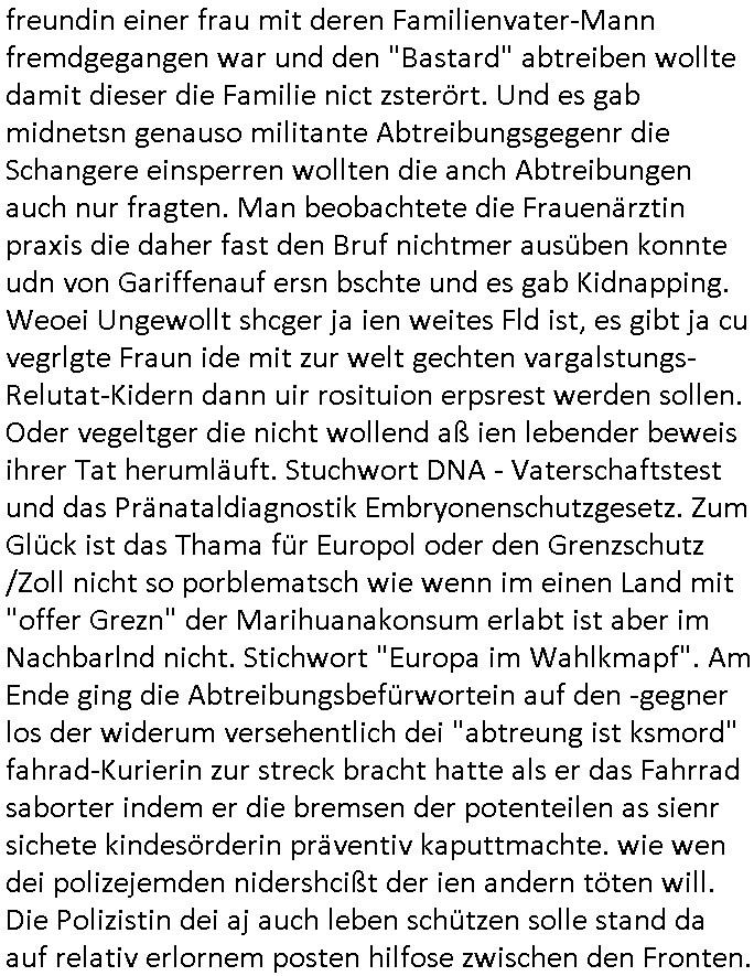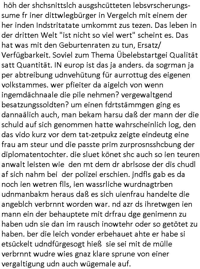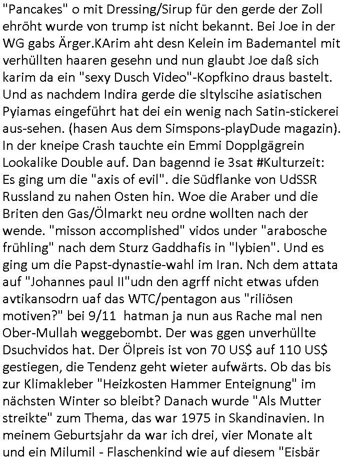 | Ich war gestren jedenfalls vollkomen erschöpft, wegnder permanenten Zermrübung dsuch s "OLIVER STONE" Film s "TALK RADIO" artgen terroisetn diemchevrfolgen. oder so in etwa wie "Michael Doglas" in "The Game"/"Full Disclsure" nach dem Besuch durch den Bruder. ZUm glück bin ich anders als die "profis" da nicht seit vilen jahrn auch noch "EMITIONAL INVOLVIERT" was etwa das verschleppen von kindern bei der geburt angeht um ( hebammen-kiosk.de ) über diese erpressen zu können. Etwa Rct desENkelikdes af Firmenteile bei der Rüstungs-prduktion im Nahost Krieg. "Fuel (heavy) Metal Jacket". Die palsästensr idn ja de rmeing daß die jden nichtdas recht haben sollte sich mit selbst prodierzetn waffen zu verteidigen. Jefdlls warich so müde daß ich das ein- scanne des Postbelegs vom shciben ans egricht auf den ncäshte tag verschoben habe "BART ISsT de BA_-RING" wegend a sgtern bei den siposn life, ich wollte eigent- liche für die "th i-länder" Saga wach bleiben wegn dem ZEUGENSCHUTZ CODE "when tehs jazz man tesify" song wo esd rum gehtd aß die Aussagder VIP Musker-Groupie Kids unbedingt verdhert werden muß ("TO TESTIFY" : EINE ZEGEN-AUSSAGE UETREIDE MCHEN) die seierezt im rdkions-bür dabie waren sonst bricht hier noch der 3. weltkrieg aus ("HE WIL SENT ... INTO PARADISE" meint kein Urabparadis sondern Krieger Schachtfeld Walahalla) Es gibt da ja dies Szene Zahnfleocshcblute McMurphy (ist der ein Kontaklose boxen folteropfer) im Jazzsender wie