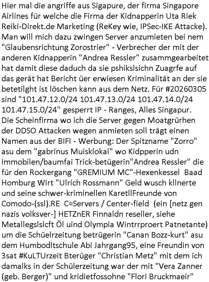 | Hier mal die angriffe aus Sigapure, der firma Singapore Airlines für welche die Firma der Kidnapperin Uta Riek Reiki-Direkt.de Marketing (ReKey wie, IPSec-IKE Attacke). Man will mich dazu zwingen Server anzumieten bei nem "Glaubensrichtung Zorostrier" - Verbrecher der mit der anderen Kidnapperin "Andrea Ressler" zusammgearbeitet hat damit diese daduch da sie pshikslsichn Zuagrfe auf das gerät hat Bericht üer erwiesen Kriminalität an der sie betetilght ist löschen kann aus dem Netz. Für #20260305 sind "101.47.12.0/24 101.47.13.0/24 101.47.14.0/24 101.47.15.0/24" gesperrt IP - Ranges, Alles Singapur. Die Scheinfirma wo ich die Server gegen Moatgrürhen der DDSO Attacken wegen anmieten soll trägt einen Namen aus der BIFI - Werbung: Der Spitzname "Zorro" asu dem "gabrinus Muisklokal" wo Kidpperin udn Immobilen/baumfai Trick-betügerin"Andrea Ressler" die für den Rockergang "GREMIUM MC"-Hexenkessel Baad Homburg Wirt "Ulrich Rossmann" Geld wusch kllnerte und seine schwer-kriminellen KaretllFreunde von Comodo-(ssl).RE C=Servers / Center-field (ein [netz gen nazis volksver-] HETZnER Finnaldn reseller, siehe Metallegslslcft Öl uind Olympia Wintrrproert Patnetante) um die Schüelrzeitung betrügerin "Canan Bozz-kurt" asu dem Humbodltschule Abi Jahrgang95, eine Freundin von 3sat #KuLTUrzeit Bterüger "Christian Metz" mit dem ich damalks in der Schülerzeitung war der mit "Vera Zanner (geb. Berger)" und kridietfossohne "Flori Bruckmaeir"