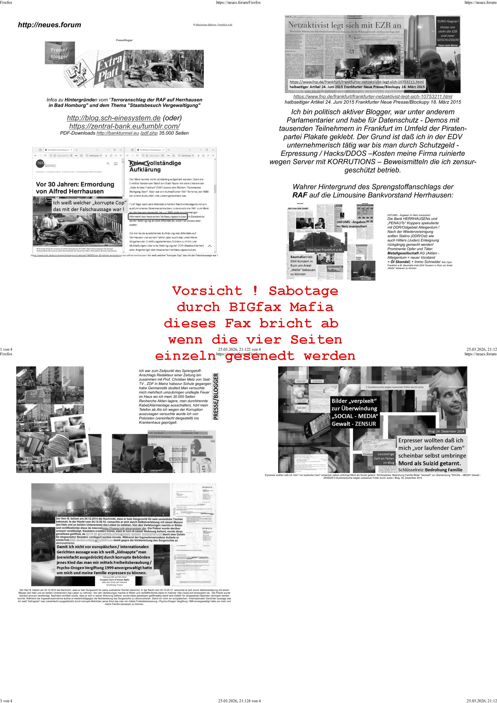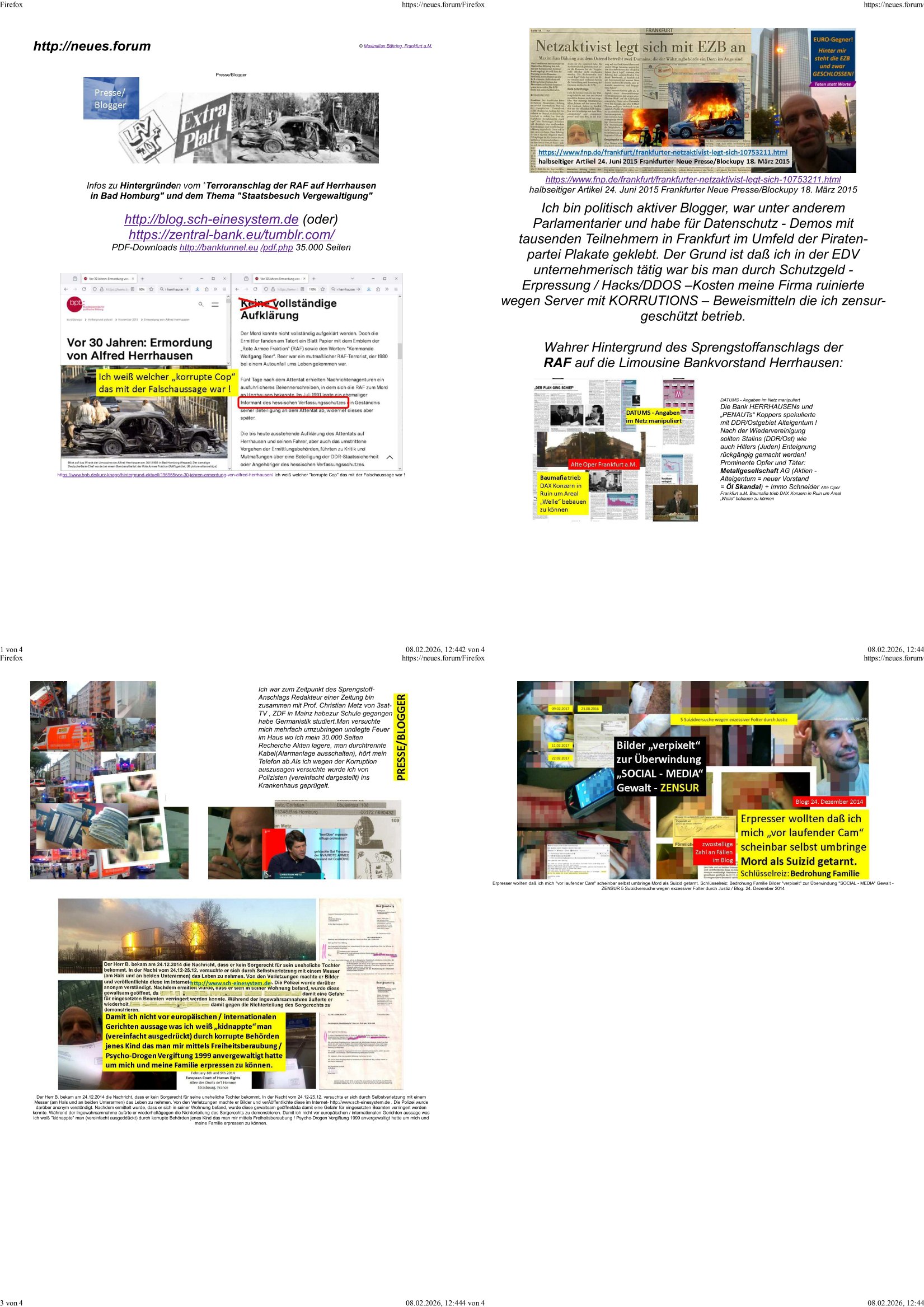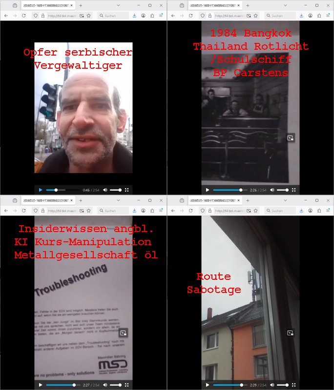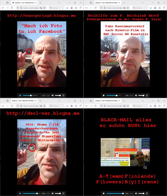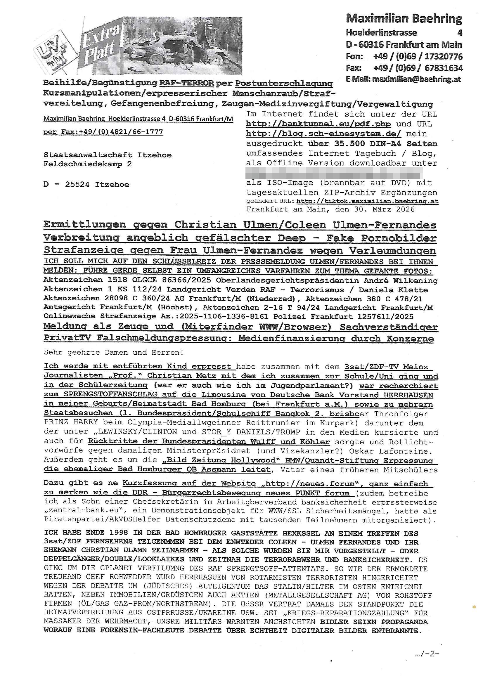 Maximilian Baehring Hoelderlinstrasse 4 D-60316 Frankfurt/M per Fax:+49/(0)4821/66-1777 Staatsanwaltschaft Itzehoe Feldschmiedekamp 2 D - 25524 Itzehoe Im Internet findet sich unter der URL http://banktunnel.eu/pdf.php und URL http://blog.sch-einesystem.de/ mein ausgedruckt über 35.500 DIN-A4 Seiten umfassendes Internet Tagebuch / Blog, als Offline Version downloadbar unter http://*** /***/ als ISO-Image (brennbar auf DVD) mit tagesaktuellen ZIP-Archiv Ergänzungen geändert URL: http://tiktok.maximilian.baehring.at Frankfurt am Main, den 30. März 2026 Ermittlungen gegen Christian Ulmen/Coleen Ulmen-Fernandes Verbreitung angeblich gefälschter Deep - Fake Pornobilder Strafanzeige gegen Frau Ulmen-Fernandez wegen Verleumdungen ICH SOLL MICH AUF DEN SCHLÜSSELREIZ DER PRESSEMELDUNG ULMEN/FERNANDES BEI IHNEN MELDEN: FÜHRE GERDE SELBST EIN UMFANGREICHES VARFAHREN ZUM THEMA GEFAKTE FOTOS: Aktenzeichen 1518 OLGCE 86366/2025 Oberlandesgerichtspräsidentin André Wilkening Aktenzeichen 1 KS 112/24 Landgericht Verden RAF - Terrorismus / Daniela Klette Aktenzeichen 28098 C 360/24 AG Frankfurt/M (Niederrad), Aktenzeichen 380 C 478/21 Amtsgericht Frankfurt/M (Höchst), Aktenzeichen 2-16 T 94/24 Landgericht Frankfurt/M Onlinewache Strafanzeige Az.:2025-1106-1336-8161 Polizei Frankfurt 1257611/2025 Meldung als Zeuge und (Miterfinder WWW/Browser) Sachverständiger PrivatTV Falschmeldungspressung: Medienfinanzierung durch Konzerne Sehr geehrte Damen und Herren! Ich werde mit entführtem Kind erpresst habe zusammen mit dem 3sat/ZDF-TV Mainz Journalisten „Prof.“ Christian Metz mit dem ich zusammen zur Schule/Uni ging und in der Schülerzeitung (war er auch wie ich im Jugendparlament?) war recherchiert zum SPRENGSTOFFANSCHLAG auf die Limousine von Deutsche Bank Vorstand HERRHAUSEN in meiner Geburts/Heimatstadt Bad Homburg (bei Frankfurt a.M.) sowie zu mehrern Staatsbesuchen (1. Bundespräsident/Schulschiff Bangkok 2. brishcer Thronfolger PRINZ HARRY beim Olympia-Mediallwgeinner Reittrunier im Kurpark) darunter dem der unter „LEWINSKY/CLINTON und STOR_Y DANIELS/TRUMP in den Medien kursierte und auch für Rücktritte der Bundespräsidenten Wulff und Köhler sorgte und Rotlicht- vorwürfe gegen damaligen Ministerpräsidnet (und Vizekanzler?) Oskar Lafontaine. Außerdem geht es um die „Bild Zeitung Hollywood“ BMW/Quandt-Stiftung Erpressung die ehemaliger Bad Homburger OB Assmann leitet, Vater eines früheren Mitschülers Dazu gibt es ne Kurzfassung auf der Website „http://neues.forum“, ganz einfach zu merken wie die DDR - Bürgerrechtsbewegung neues PUNKT forum (zudem betreibe ich als Sohn einer Chefsekretärin im Arbeitgberverband banksicherheit erprssterweise „zentral-bank.eu“, ein Demonstrationsobjekt für WWW/SSL Sicherheitsmängel, hatte als Piratenpartei/AkVDSHelfer Datenschutzdemo mit tausenden Teilnehmern mitorganisiert). ICH HABE ENDE 1998 IN DER BAD HOMBRUGER GASTSTÄTTE HEXKSSEL AN EINEM TREFFEN DES 3sat/ZDF FERNSEHENS TELGENMMEN BEI DEM ENWTEDER COLEEN - ULMEN FERNANDES UND IHR EHEMANN CHRSTIAN ULAMN TEILNAHMEN – ALS SOLCHE WURDEN SIE MIR VORGESTELLT – ODER DEPPELGÄNGER/DOUBLE/LOOKLAIKES UND ZEITNAH DIE TERRORABWEHR UND BANKSICHERHEIT. ES GING UM DIE GPLANET VERFILUMNG DES RAF SPRENGTSOFF-ATTENTATS. SO WIE DER ERMORDETE TREUHAND CHEF ROHWEDDER WURD HERRHASUEN VON ROTARMISTEN TERRORISTEN HINGERICHTET WEGEN DER DEBATTE UM (JÜDISCHES) ALTEIGENTUM DAS STALIN/HILTER IM OSTEN ENTEIGNET HATTEN, NEBEN IMMOBILIEN/GRDÜSTCEN AUCH AKTIEN (METALLGESELLSCHAFT AG) VON ROHSTOFF FIRMEN (ÖL/GAS GAZ-PROM/NORTHSTREAM). DIE UdSSR VERTRAT DAMALS DEN STANDPUNKT DIE HEIMATVERTREIBUNG AUS OSTPRRUSSE/UKAREINE USW. SEI „KRIEGS-REPARATIONSZAHLUNG“ FÜR MASSAKER DER WEHRMACHT, UNSRE MILITÄRS WARNTEN ANCHSICHTEN BIDLER SEIEN PROPAGANDA WORAUF EINE FORENSIK-FACHLEUTE DEBATTE ÜBER ECHTHEIT DIGITALER BILDER ENTBRANNTE. Man gab damals an daß die Ukrunden mit dne altgetum DURCH DIE TREUHANDANSTALT DES VON DER RAF ERMORDETEN ROHWEDER rückgeforderr würde ja tils dch die Wiedervereingung oder das den der nazi Dikatur ungültig geworden seien. Daraus wurde dann der Kino - Film „Schtonk“ wo es um BKA Shcftguachten geht und die Hitler-Tagebücher. Das Dreh- Buch autoren-Team um den inder 3sat Sendung Kurzet wo „Christian Metz“ immer wieder aufttitt gehypten Fäscher Kujau ist mir bekannt. Ichslebst werde banfsl erpest und zwar wiel ich als kleines Kind ne Kita Erzieherin hat die in ViP/Promi Kreisen der RHEIN MAIN GEBIET OLYPIA GOLD-MEDAILLEN GEWINNER REITSTÄLLE verkehrte. Anlälich irhe hochte und Charity Turnieren im Kurpark wurden supereriche Oligarchen hochadelige asiatischer Königshäser eingeflogen samt Pferden genau wie dr brische Reiteradel, die Thronfolger. Korrupte Sicherheitsdienstleister machten mit Üebrshcusgkaeras Fots von den VIPs-Kindern/Thronfolgern im WC – Bereich der Kita und vsshctendiese an die „Yellwo Prsse“, Blodervadmagazin zu veräußern in- dem sie kder wie mch dazu missbrauchten nchzstelenwasufden Fotos zu sehen sei. Da- durch gab es dan die MISSBRCHSsdbatte in der Kita der KATHOLOSCHEN KIRCHE in Worms/ Mainz, die Kirchengemeinde Bad Homburg Ober-Erlenbach mit der integrativen Kita in der Weingartenstraße gehört da verwaltusgtechnisch/orgaisatorsch dazu. Die Erprssung durch die Sicherheitsleuet ist Inhalt zahlreiche Gerichtsverfahren von Prinz Harry die groß duch alle Zeitungen gingen. Auch da versichte ma sich auf „photohop Fakes“ rauszureden, man erprsste die Missbrauchsopfer. Der Homosexuele filmeamcher „Walter Moers“ und „sTill SchweigEr“ drehten sogar ganze Erprsserkinofilme. Ein fmaile ign für mehre jahre nach Bagkok, Thailand woe mein Vater ein Bergwerk an der Gzeze zy Maymar/Birma/Burma leitete das zum Metallgesslcft AG konzern gehört und gezielt erpresst wird, der letztee Erprssrfilm lief am 15. März 2026, 19:00 Uhr im Fernsehen, damit wollte man mich und meinen Vater zwingen ausf Lösegeldfoderungen eizehen: Vosrcht da sind Itrepo