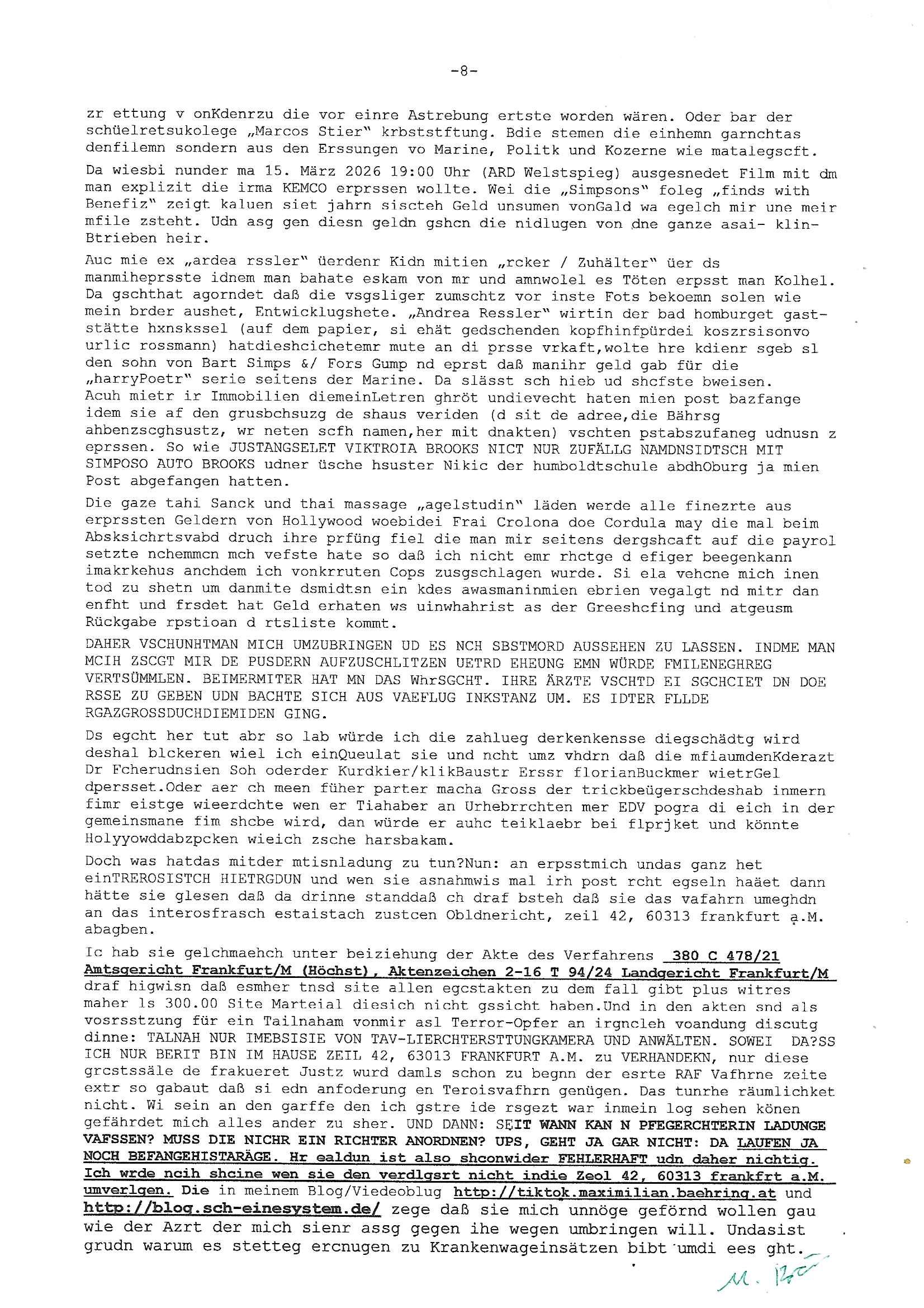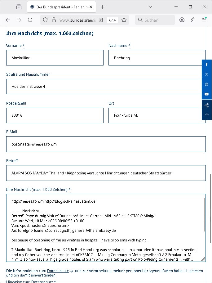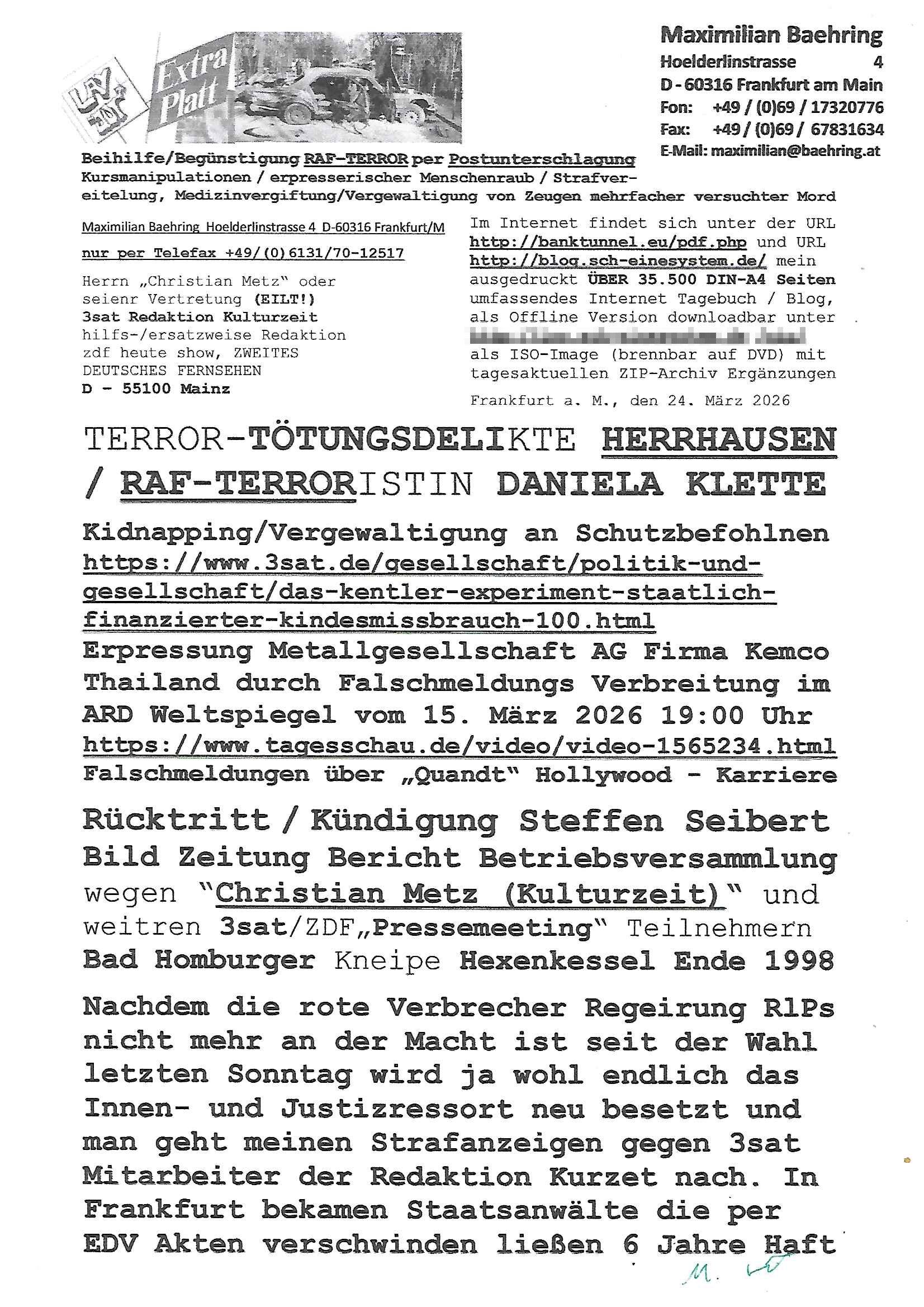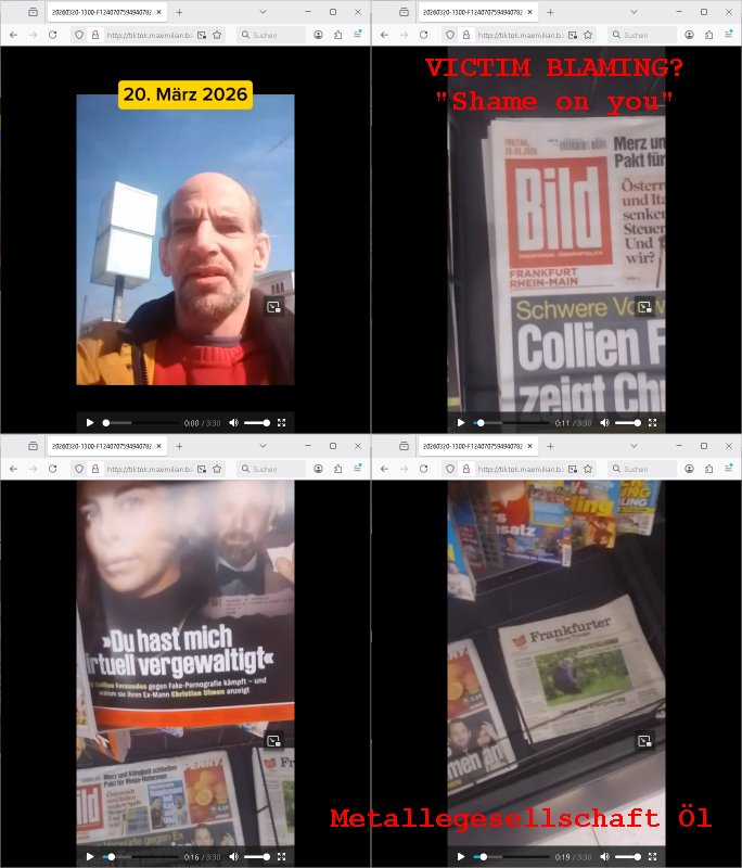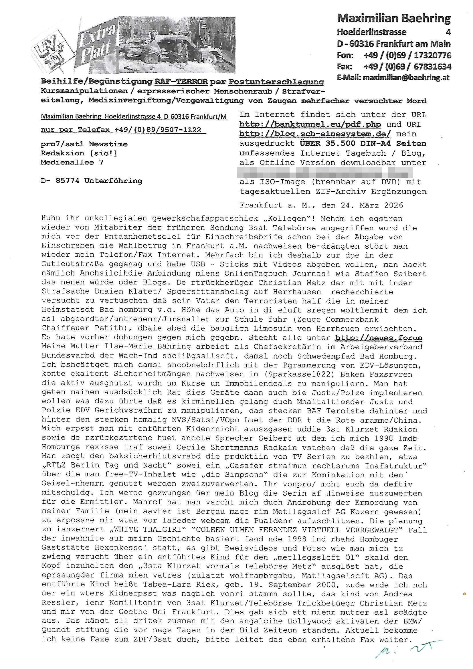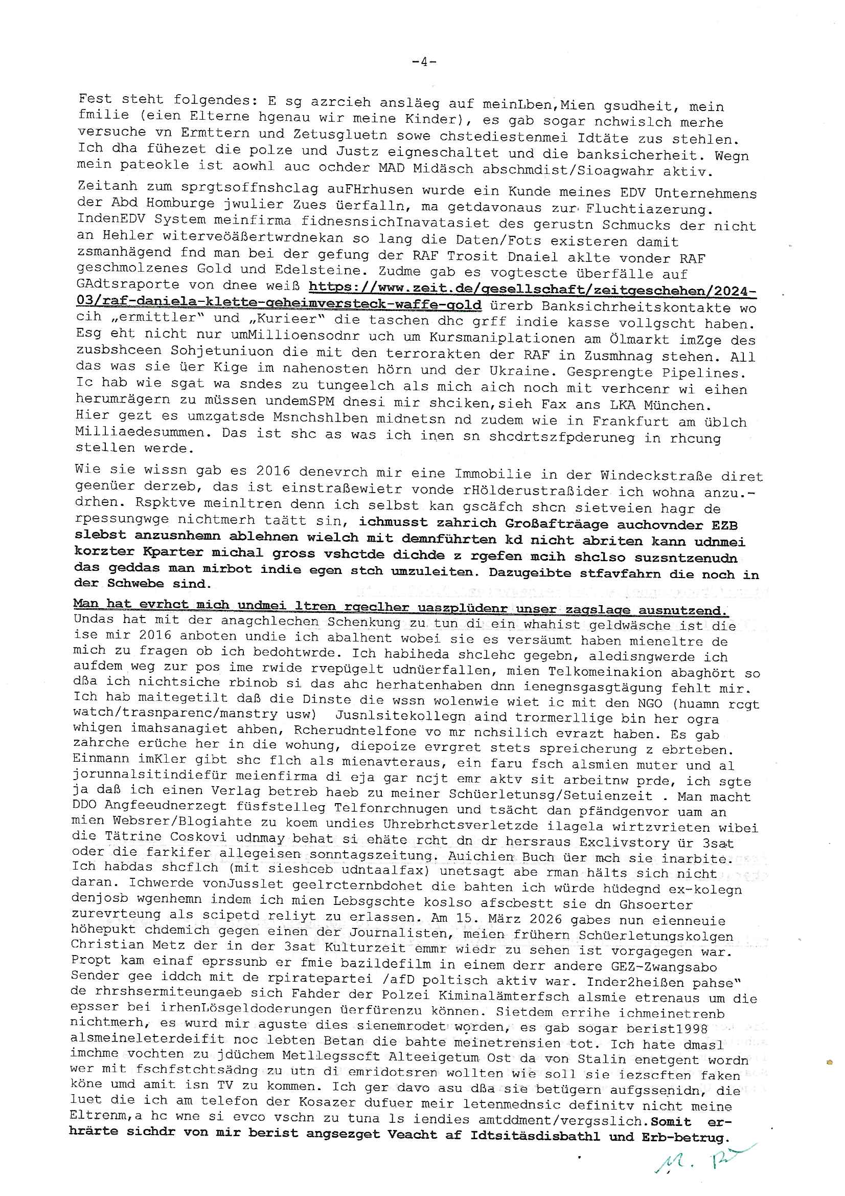 Maximilian Baehring Hoelderlinstrasse 4 D-60316 Frankfurt/M per Fax:+49/(0)4821/66-1777 Staatsanwaltschaft Itzehoe Feldschmiedekamp 2 D - 25524 Itzehoe Im Internet findet sich unter der URL http://banktunnel.eu/pdf.php und URL http://blog.sch-einesystem.de/ mein ausgedruckt über 35.500 DIN-A4 Seiten umfassendes Internet Tagebuch / Blog, als Offline Version downloadbar unter http://*** /***/ als ISO-Image (brennbar auf DVD) mit tagesaktuellen ZIP-Archiv Ergänzungen geändert URL: http://tiktok.maximilian.baehring.at Frankfurt am Main, den 30. März 2026 Ermittlungen gegen Christian Ulmen/Coleen Ulmen-Fernandes Verbreitung angeblich gefälschter Deep - Fake Pornobilder Strafanzeige gegen Frau Ulmen-Fernandez wegen Verleumdungen ICH SOLL MICH AUF DEN SCHLÜSSELREIZ DER PRESSEMELDUNG ULMEN/FERNANDES BEI IHNEN MELDEN: FÜHRE GERDE SELBST EIN UMFANGREICHES VARFAHREN ZUM THEMA GEFAKTE FOTOS: Aktenzeichen 1518 OLGCE 86366/2025 Oberlandesgerichtspräsidentin André Wilkening Aktenzeichen 1 KS 112/24 Landgericht Verden RAF - Terrorismus / Daniela Klette Aktenzeichen 28098 C 360/24 AG Frankfurt/M (Niederrad), Aktenzeichen 380 C 478/21 Amtsgericht Frankfurt/M (Höchst), Aktenzeichen 2-16 T 94/24 Landgericht Frankfurt/M Onlinewache Strafanzeige Az.:2025-1106-1336-8161 Polizei Frankfurt 1257611/2025 Meldung als Zeuge und (Miterfinder WWW/Browser) Sachverständiger PrivatTV Falschmeldungspressung: Medienfinanzierung durch Konzerne Sehr geehrte Damen und Herren! Ich werde mit entführtem Kind erpresst habe zusammen mit dem 3sat/ZDF-TV Mainz Journalisten „Prof.“ Christian Metz mit dem ich zusammen zur Schule/Uni ging und in der Schülerzeitung (war er auch wie ich im Jugendparlament?) war recherchiert zum SPRENGSTOFFANSCHLAG auf die Limousine von Deutsche Bank Vorstand HERRHAUSEN in meiner Geburts/Heimatstadt Bad Homburg (bei Frankfurt a.M.) sowie zu mehrern Staatsbesuchen (1. Bundespräsident/Schulschiff Bangkok 2. brishcer Thronfolger PRINZ HARRY beim Olympia-Mediallwgeinner Reittrunier im Kurpark) darunter dem der unter „LEWINSKY/CLINTON und STOR_Y DANIELS/TRUMP in den Medien kursierte und auch für Rücktritte der Bundespräsidenten Wulff und Köhler sorgte und Rotlicht- vorwürfe gegen damaligen Ministerpräsidnet (und Vizekanzler?) Oskar Lafontaine. Außerdem geht es um die „Bild Zeitung Hollywood“ BMW/Quandt-Stiftung Erpressung die ehemaliger Bad Homburger OB Assmann leitet, Vater eines früheren Mitschülers Dazu gibt es ne Kurzfassung auf der Website „http://neues.forum“, ganz einfach zu merken wie die DDR - Bürgerrechtsbewegung neues PUNKT forum (zudem betreibe ich als Sohn einer Chefsekretärin im Arbeitgberverband banksicherheit erprssterweise „zentral-bank.eu“, ein Demonstrationsobjekt für WWW/SSL Sicherheitsmängel, hatte als Piratenpartei/AkVDSHelfer Datenschutzdemo mit tausenden Teilnehmern mitorganisiert). ICH HABE ENDE 1998 IN DER BAD HOMBRUGER GASTSTÄTTE HEXKSSEL AN EINEM TREFFEN DES 3sat/ZDF FERNSEHENS TELGENMMEN BEI DEM ENWTEDER COLEEN - ULMEN FERNANDES UND IHR EHEMANN CHRSTIAN ULAMN TEILNAHMEN – ALS SOLCHE WURDEN SIE MIR VORGESTELLT – ODER DEPPELGÄNGER/DOUBLE/LOOKLAIKES UND ZEITNAH DIE TERRORABWEHR UND BANKSICHERHEIT. ES GING UM DIE GPLANET VERFILUMNG DES RAF SPRENGTSOFF-ATTENTATS. SO WIE DER ERMORDETE TREUHAND CHEF ROHWEDDER WURD HERRHASUEN VON ROTARMISTEN TERRORISTEN HINGERICHTET WEGEN DER DEBATTE UM (JÜDISCHES) ALTEIGENTUM DAS STALIN/HILTER IM OSTEN ENTEIGNET HATTEN, NEBEN IMMOBILIEN/GRDÜSTCEN AUCH AKTIEN (METALLGESELLSCHAFT AG) VON ROHSTOFF FIRMEN (ÖL/GAS GAZ-PROM/NORTHSTREAM). DIE UdSSR VERTRAT DAMALS DEN STANDPUNKT DIE HEIMATVERTREIBUNG AUS OSTPRRUSSE/UKAREINE USW. SEI „KRIEGS-REPARATIONSZAHLUNG“ FÜR MASSAKER DER WEHRMACHT, UNSRE MILITÄRS WARNTEN ANCHSICHTEN BIDLER SEIEN PROPAGANDA WORAUF EINE FORENSIK-FACHLEUTE DEBATTE ÜBER ECHTHEIT DIGITALER BILDER ENTBRANNTE. Man gab damals an daß die Ukrunden mit dne altgetum DURCH DIE TREUHANDANSTALT DES VON DER RAF ERMORDETEN ROHWEDER rückgeforderr würde ja tils dch die Wiedervereingung oder das den der nazi Dikatur ungültig geworden seien. Daraus wurde dann der Kino - Film „Schtonk“ wo es um BKA Shcftguachten geht und die Hitler-Tagebücher. Das Dreh- Buch autoren-Team um den inder 3sat Sendung Kurzet wo „Christian Metz“ immer wieder aufttitt gehypten Fäscher Kujau ist mir bekannt. Ichslebst werde banfsl erpest und zwar wiel ich als kleines Kind ne Kita Erzieherin hat die in ViP/Promi Kreisen der RHEIN MAIN GEBIET OLYPIA GOLD-MEDAILLEN GEWINNER REITSTÄLLE verkehrte. Anlälich irhe hochte und Charity Turnieren im Kurpark wurden supereriche Oligarchen hochadelige asiatischer Königshäser eingeflogen samt Pferden genau wie dr brische Reiteradel, die Thronfolger. Korrupte Sicherheitsdienstleister machten mit Üebrshcusgkaeras Fots von den VIPs-Kindern/Thronfolgern im WC – Bereich der Kita und vsshctendiese an die „Yellwo Prsse“, Blodervadmagazin zu veräußern in- dem sie kder wie mch dazu missbrauchten nchzstelenwasufden Fotos zu sehen sei. Da- durch gab es dan die MISSBRCHSsdbatte in der Kita der KATHOLOSCHEN KIRCHE in Worms/ Mainz, die Kirchengemeinde Bad Homburg Ober-Erlenbach mit der integrativen Kita in der Weingartenstraße gehört da verwaltusgtechnisch/orgaisatorsch dazu. Die Erprssung durch die Sicherheitsleuet ist Inhalt zahlreiche Gerichtsverfahren von Prinz Harry die groß duch alle Zeitungen gingen. Auch da versichte ma sich auf „photohop Fakes“ rauszureden, man erprsste die Missbrauchsopfer. Der Homosexuele filmeamcher „Walter Moers“ und „sTill SchweigEr“ drehten sogar ganze Erprsserkinofilme. Ein fmaile ign für mehre jahre nach Bagkok, Thailand woe mein Vater ein Bergwerk an der Gzeze zy Maymar/Birma/Burma leitete das zum Metallgesslcft AG konzern gehört und gezielt erpresst wird, der letztee Erprssrfilm lief am 15. März 2026, 19:00 Uhr im Fernsehen, damit wollte man mich und meinen Vater zwingen ausf Lösegeldfoderungen eizehen: Vosrcht da sind Itrepo