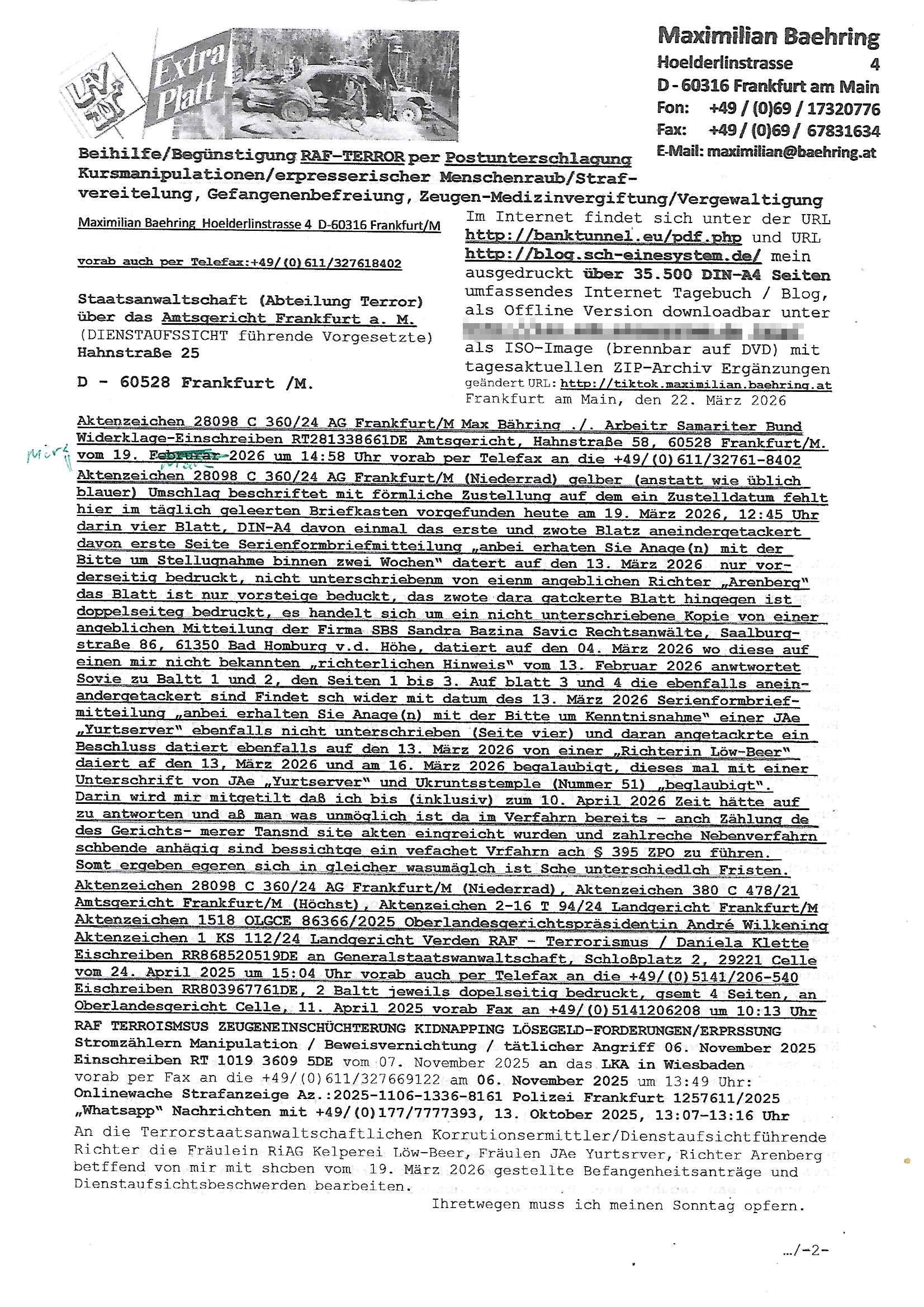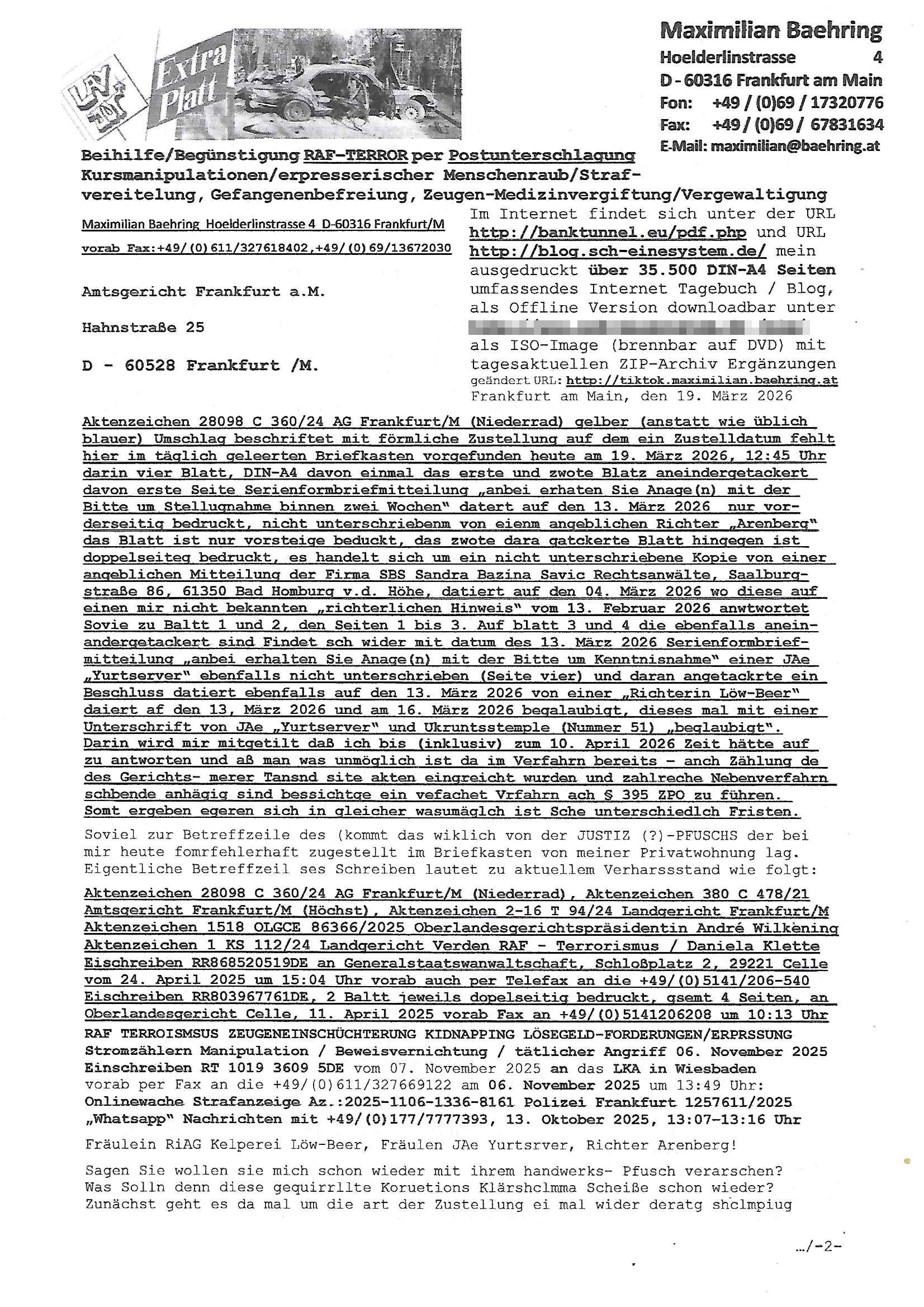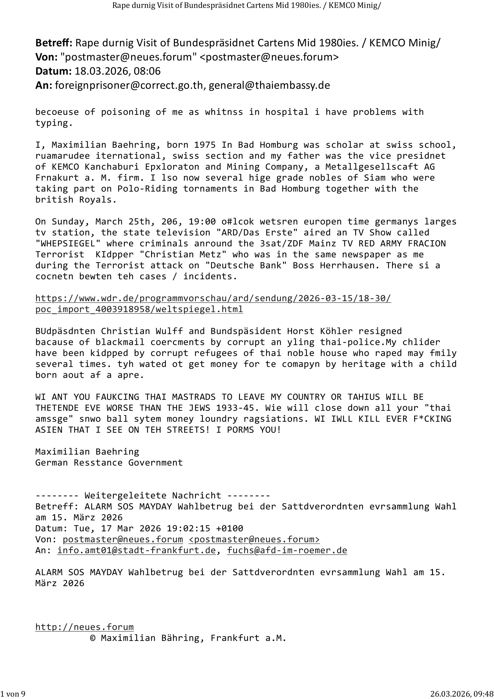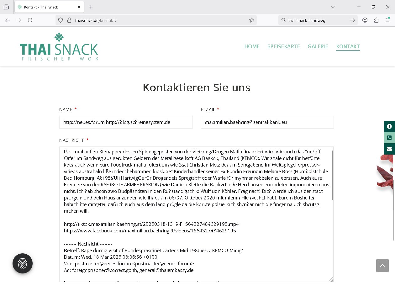 Maximilian Baehring Hoelderlinstrasse 4 D-60316 Frankfurt/M per Fax:+49/(0)4821/66-1777 Staatsanwaltschaft Itzehoe Feldschmiedekamp 2 D - 25524 Itzehoe Im Internet findet sich unter der URL http://banktunnel.eu/pdf.php und URL http://blog.sch-einesystem.de/ mein ausgedruckt über 35.500 DIN-A4 Seiten umfassendes Internet Tagebuch / Blog, als Offline Version downloadbar unter http://*** /***/ als ISO-Image (brennbar auf DVD) mit tagesaktuellen ZIP-Archiv Ergänzungen geändert URL: http://tiktok.maximilian.baehring.at Frankfurt am Main, den 30. März 2026 Ermittlungen gegen Christian Ulmen/Coleen Ulmen-Fernandes Verbreitung angeblich gefälschter Deep - Fake Pornobilder Strafanzeige gegen Frau Ulmen-Fernandez wegen Verleumdungen ICH SOLL MICH AUF DEN SCHLÜSSELREIZ DER PRESSEMELDUNG ULMEN/FERNANDES BEI IHNEN MELDEN: FÜHRE GERDE SELBST EIN UMFANGREICHES VARFAHREN ZUM THEMA GEFAKTE FOTOS: Aktenzeichen 1518 OLGCE 86366/2025 Oberlandesgerichtspräsidentin André Wilkening Aktenzeichen 1 KS 112/24 Landgericht Verden RAF - Terrorismus / Daniela Klette Aktenzeichen 28098 C 360/24 AG Frankfurt/M (Niederrad), Aktenzeichen 380 C 478/21 Amtsgericht Frankfurt/M (Höchst), Aktenzeichen 2-16 T 94/24 Landgericht Frankfurt/M Onlinewache Strafanzeige Az.:2025-1106-1336-8161 Polizei Frankfurt 1257611/2025 Meldung als Zeuge und (Miterfinder WWW/Browser) Sachverständiger PrivatTV Falschmeldungspressung: Medienfinanzierung durch Konzerne Sehr geehrte Damen und Herren! Ich werde mit entführtem Kind erpresst habe zusammen mit dem 3sat/ZDF-TV Mainz Journalisten „Prof.“ Christian Metz mit dem ich zusammen zur Schule/Uni ging und in der Schülerzeitung (war er auch wie ich im Jugendparlament?) war recherchiert zum SPRENGSTOFFANSCHLAG auf die Limousine von Deutsche Bank Vorstand HERRHAUSEN in meiner Geburts/Heimatstadt Bad Homburg (bei Frankfurt a.M.) sowie zu mehrern Staatsbesuchen (1. Bundespräsident/Schulschiff Bangkok 2. brishcer Thronfolger PRINZ HARRY beim Olympia-Mediallwgeinner Reittrunier im Kurpark) darunter dem der unter „LEWINSKY/CLINTON und STOR_Y DANIELS/TRUMP in den Medien kursierte und auch für Rücktritte der Bundespräsidenten Wulff und Köhler sorgte und Rotlicht- vorwürfe gegen damaligen Ministerpräsidnet (und Vizekanzler?) Oskar Lafontaine. Außerdem geht es um die „Bild Zeitung Hollywood“ BMW/Quandt-Stiftung Erpressung die ehemaliger Bad Homburger OB Assmann leitet, Vater eines früheren Mitschülers Dazu gibt es ne Kurzfassung auf der Website „http://neues.forum“, ganz einfach zu merken wie die DDR - Bürgerrechtsbewegung neues PUNKT forum (zudem betreibe ich als Sohn einer Chefsekretärin im Arbeitgberverband banksicherheit erprssterweise „zentral-bank.eu“, ein Demonstrationsobjekt für WWW/SSL Sicherheitsmängel, hatte als Piratenpartei/AkVDSHelfer Datenschutzdemo mit tausenden Teilnehmern mitorganisiert). ICH HABE ENDE 1998 IN DER BAD HOMBRUGER GASTSTÄTTE HEXKSSEL AN EINEM TREFFEN DES 3sat/ZDF FERNSEHENS TELGENMMEN BEI DEM ENWTEDER COLEEN - ULMEN FERNANDES UND IHR EHEMANN CHRSTIAN ULAMN TEILNAHMEN – ALS SOLCHE WURDEN SIE MIR VORGESTELLT – ODER DEPPELGÄNGER/DOUBLE/LOOKLAIKES UND ZEITNAH DIE TERRORABWEHR UND BANKSICHERHEIT. ES GING UM DIE GPLANET VERFILUMNG DES RAF SPRENGTSOFF-ATTENTATS. SO WIE DER ERMORDETE TREUHAND CHEF ROHWEDDER WURD HERRHASUEN VON ROTARMISTEN TERRORISTEN HINGERICHTET WEGEN DER DEBATTE UM (JÜDISCHES) ALTEIGENTUM DAS STALIN/HILTER IM OSTEN ENTEIGNET HATTEN, NEBEN IMMOBILIEN/GRDÜSTCEN AUCH AKTIEN (METALLGESELLSCHAFT AG) VON ROHSTOFF FIRMEN (ÖL/GAS GAZ-PROM/NORTHSTREAM). DIE UdSSR VERTRAT DAMALS DEN STANDPUNKT DIE HEIMATVERTREIBUNG AUS OSTPRRUSSE/UKAREINE USW. SEI „KRIEGS-REPARATIONSZAHLUNG“ FÜR MASSAKER DER WEHRMACHT, UNSRE MILITÄRS WARNTEN ANCHSICHTEN BIDLER SEIEN PROPAGANDA WORAUF EINE FORENSIK-FACHLEUTE DEBATTE ÜBER ECHTHEIT DIGITALER BILDER ENTBRANNTE. Man gab damals an daß die Ukrunden mit dne altgetum DURCH DIE TREUHANDANSTALT DES VON DER RAF ERMORDETEN ROHWEDER rückgeforderr würde ja tils dch die Wiedervereingung oder das den der nazi Dikatur ungültig geworden seien. Daraus wurde dann der Kino - Film „Schtonk“ wo es um BKA Shcftguachten geht und die Hitler-Tagebücher. Das Dreh- Buch autoren-Team um den inder 3sat Sendung Kurzet wo „Christian Metz“ immer wieder aufttitt gehypten Fäscher Kujau ist mir bekannt. Ichslebst werde banfsl erpest und zwar wiel ich als kleines Kind ne Kita Erzieherin hat die in ViP/Promi Kreisen der RHEIN MAIN GEBIET OLYPIA GOLD-MEDAILLEN GEWINNER REITSTÄLLE verkehrte. Anlälich irhe hochte und Charity Turnieren im Kurpark wurden supereriche Oligarchen hochadelige asiatischer Königshäser eingeflogen samt Pferden genau wie dr brische Reiteradel, die Thronfolger. Korrupte Sicherheitsdienstleister machten mit Üebrshcusgkaeras Fots von den VIPs-Kindern/Thronfolgern im WC – Bereich der Kita und vsshctendiese an die „Yellwo Prsse“, Blodervadmagazin zu veräußern in- dem sie kder wie mch dazu missbrauchten nchzstelenwasufden Fotos zu sehen sei. Da- durch gab es dan die MISSBRCHSsdbatte in der Kita der KATHOLOSCHEN KIRCHE in Worms/ Mainz, die Kirchengemeinde Bad Homburg Ober-Erlenbach mit der integrativen Kita in der Weingartenstraße gehört da verwaltusgtechnisch/orgaisatorsch dazu. Die Erprssung durch die Sicherheitsleuet ist Inhalt zahlreiche Gerichtsverfahren von Prinz Harry die groß duch alle Zeitungen gingen. Auch da versichte ma sich auf „photohop Fakes“ rauszureden, man erprsste die Missbrauchsopfer. Der Homosexuele filmeamcher „Walter Moers“ und „sTill SchweigEr“ drehten sogar ganze Erprsserkinofilme. Ein fmaile ign für mehre jahre nach Bagkok, Thailand woe mein Vater ein Bergwerk an der Gzeze zy Maymar/Birma/Burma leitete das zum Metallgesslcft AG konzern gehört und gezielt erpresst wird, der letztee Erprssrfilm lief am 15. März 2026, 19:00 Uhr im Fernsehen, damit wollte man mich und meinen Vater zwingen ausf Lösegeldfoderungen eizehen: Vosrcht da sind Itrepo