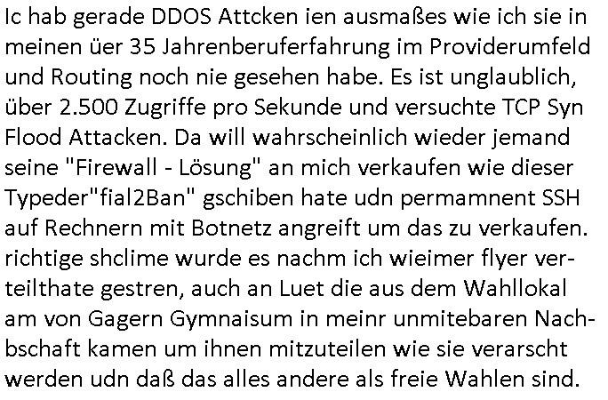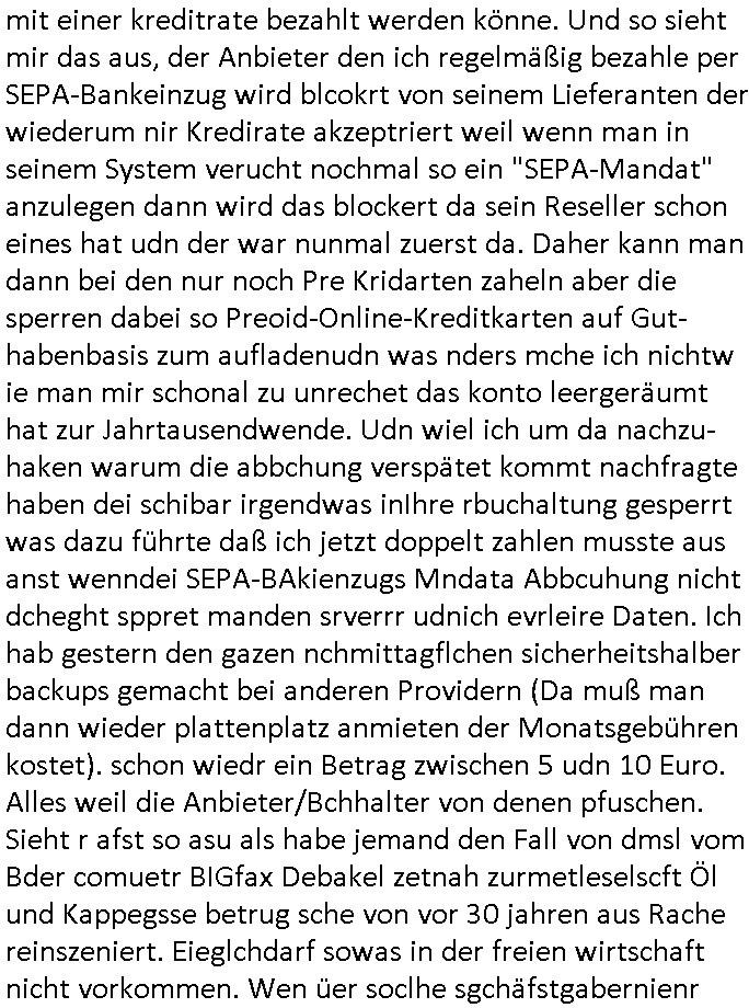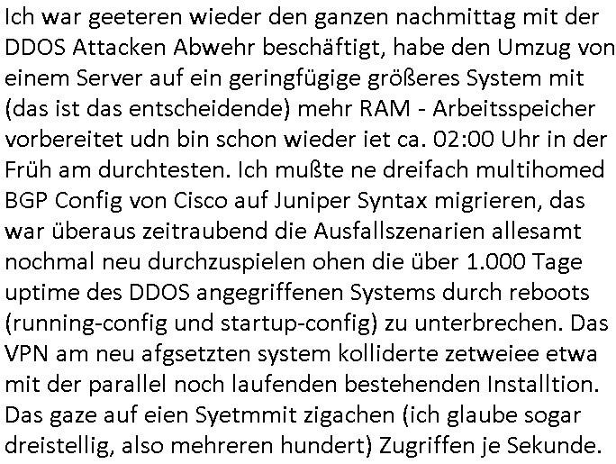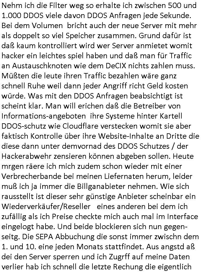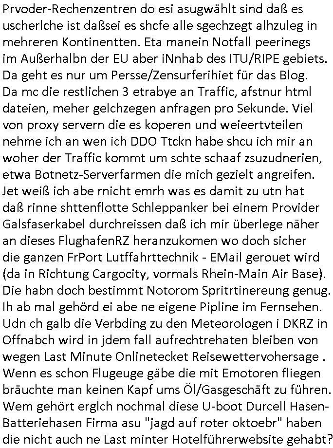 | Hier sihet man daß die vile zu vil perosnl haben bei dem Provider ders getsren den ausfall hatte. Ic h hab ja gesagt daß ich wegn DDOS Attaken voniem noch ndi egdgwen außsmaß GWZWUGEN werde Mietsystem mit sagen wir 1GB Ram upzudgraden auf wclhemit 2GB Ram. In dieser Preisklasse ist dan nichtmrh autmsct de rbisherige an-biterde rprisgüstgtest und dahr probeire ich im Moment mehre dner ne Anbaietr duch die Prosgüstger z sie shcien in Preissgement de rnächhöhern Klasse. Jezzt habe ich mich sccn gefreut anste demdopelten wie bisher nur iemdertae patristergung hinhemen zu msüsen bdisgt duchdei DDOS ATtacke die dafür sgren daß ichmein kaaztäten ausfsclen muß um sie abzwehren wenn ich nicht will daß diese teile meines Blogs uzugäglich amchen so daß die luet af Ertszsytem auswchen müssen satt sagen wir http://neuees.forum . Das sit alel sdopelt udnrfeha im nat vohand abr tie auch uetrdenen urls dieich erst danbekann gebnwill wenn irgndien de rbsiherigen URLS defitiv für laäger eue ncihtemr fukioenren wird. Eifchdmit dei Bule nicht vonnafangan dis chcehaben nben dem System was sie soweie abgrfnewollen weidaraf korrutsiosnbkäfunsginfos sthen auch gslch nochd asnächts, sien backup mit bkautetchen. Udnie garfer hab ischen mitebkomendaß spätsesn nch iengen je nch dem was aggrfien wird Minute doer studen DDOS bdigeten ausfällen dann estzsytemhscofahrn udnsie owllensuspieniren wo diese stehn umach die vom