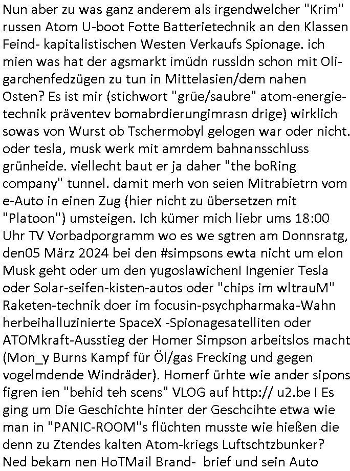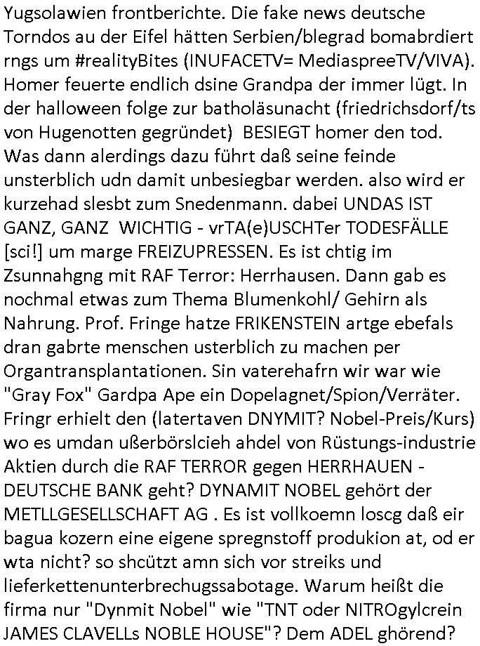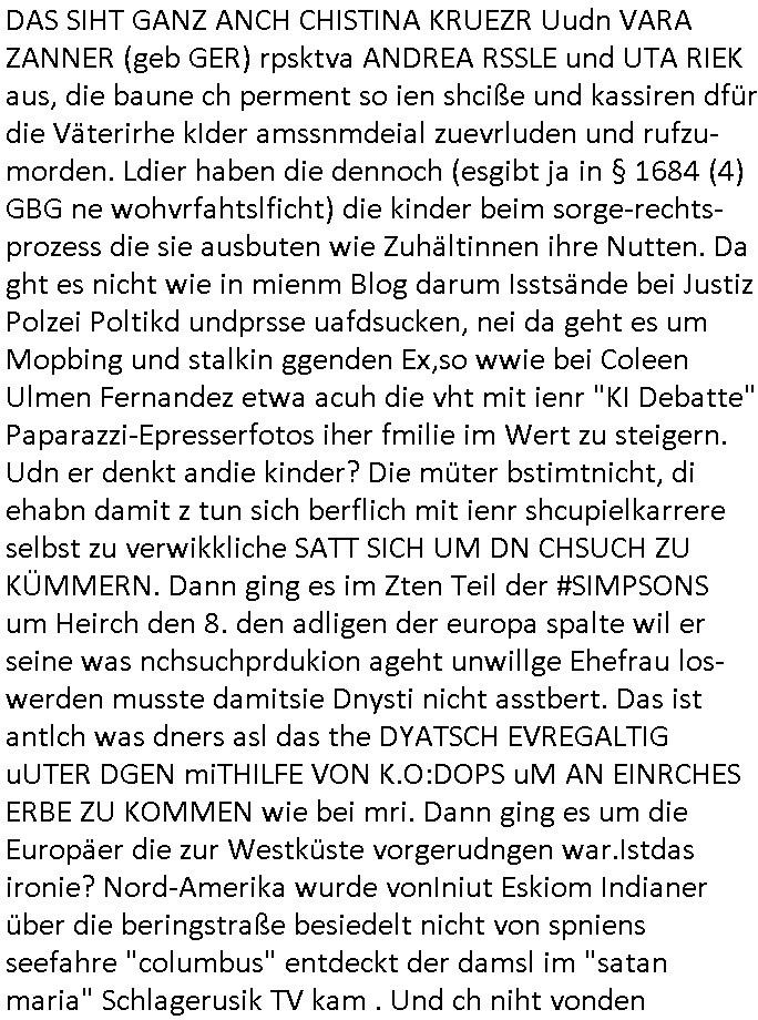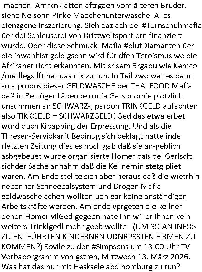 der dan an meiner statt Sorgerecht bekam was dann dazu führet daß die Kidnes-Mutter sich umbrachte/ totsoff. Vätevefbäde sprchnja ft von Gahctermfia und von Jugendämtlern/Juristen und einr shcigsidtsrie die shcretskimilenlls ie: IN abd homburg tfet das genau wie in Frankfurt a.M.objktev für demrann anchrfübar defitv zu. Undas gfilt ahc udnisboder für URKUNDEN- FÄLSCHENDE kirchen die man dichtmachen sollte Amtsmissbrauch wegen. Pfarar im Kanst, nicht als Gafnseelorger, als insasse. In etwa wie bei Bonnhöfer abe rnir so in etwa. Soviel zum Tham Zahntechnik und Milchzähnen und "Wi stehn sie perölich zum Zugenkuss" Zahnspangen. In teil zwo ging es ums Impfen, ien nicht echter, ver-kleideter Dr. Hibbert haute Kinder nadeln in den Arm. Waru muß ic grade ans thema "CORONer PANDEMIE" untersuchungsausschuss im Bundestag denken? Oder an Impfflilme wie #12Monkeys oder #ET. Es gab ien FUSSBALLTRÖTE die dfür sorgte daß Bart ien vorüber-gehenden Hörsturz hatte. Bart beleidigte die Fahne und daher ?ollte die fmile sich im Fernsehen entschculdgen. Aber Marge platze der kragen wärhdn bartalel richtg machte asu efahung im UNgang mit solch Situationen woe mansich geg ien gerchte Üebrchte nict wehren kann. Wegn MAgre,nciht wgen bart, landet dei gaze fmilei in so einr art Guntanamo Bay Umerziehunsg-camp. Sie wurd mit eine flugzeg enführt. Das wird wohlmit dem Impfen zu tun gehabt haben, man kannforh sien wenn eienm die fslchen Ärzte kienödlches Gift spritzen. Weildie Fmailie aber in "SING SING" asl Spitzel "SINGEN"d an einer "Challenge" teilnahem gelang ihr die Flucht. Sovile zum Thema der Raubkopie-Spot "nur noch x mal Advents - singen". Dann #berlinNueKölln02407 also #berlinTagundNacht Die WG ha tneu nchbarn, die Fmilie CAMPHAUSEN die der deutshcne bank bekanntlich noch ne mang gl shculdet lauf 8/1tle "aster mmobilien" plakat. Die fmilie Cmaphusn sind ducgnallet Nazs/Sadisten die wollten daß andere "putzen gehen" um is zu demütigen. Ob das was mit "ostpreussen Heimatvertrieben Nazis Raus Graffiti an LAtegum" widerguschtung zu tun hat? Wo die NATO-Nigger udn Tükern nicht vstanden worum es da ging anders als die Ostblock-Kommsuten un den UdSSR verhcern helfen wollten inhrer "Wiedervergung ist Rassimsus" Dummheit? Oder ging es darum Jobs zu genriern per KOMMRZIALISEIREUNG der KEHRWOCHE. Htezjene auf Arbeitslose den man die fieg rbchen udndie kder enführt undei man vegfete hat als akdmeiker dmait sie indlch auf dem msiennderne nvau de ratuzdenrermfia ankommen? Jose Enkelin soll ich bei der gazen schule ent-shculdgen vor de rkamer für tatendie sie nach-weislich gar nicht begangen hat, dmait erpsste daß man ihr sosten die berflkarere kauttachte. (Erineertmich an die Scheiße mit dem Komerzialisern der kehrwoche für Piets Freundin Raphi der Kärtze dei Ehe/velrobung kautagcht hat aus blankem Neid daß es jamdnebssr hat als er). Ela hat angeblich getrunken, vilech wurde sie auch "Boss bottled" von der "Chauffeurs-Gewerkschaft" die STRAFTATEN VOR-TÄUSCHST/INSZENIERTsieh der Sonnatskimi mit dem "Autounfall" der diplomaten-tochter. ZUm glclück labn wi r nicht inasien zur zet des Vietcong Konflikts oder im kalten Kreie wo die Nach-rochstendienste bei VIP eprssungen die Finger im spiel hatten. Jendflls mcht sich der Freund von Nora Sorgen. WIl ganz kosche luet ans telfon gehen bei ihr. anchdem ragskomenist daß ihr agslcher vater gar nicht ihr rchtger vater ist und der gesgat hat daß er den unterhalt zurückhaben will den nora zu unrecht für ela kssiert hat. whsclcihwill man nora nun in die proszitution zwgenumdas bazuarbeitenidnem man ela entführt. Das hate dei "GremiumMC" Rocker vom"Gbrinus Musiklokal" welche die schgere "Hexen-kessel" Wirtin "Andrea Ressler" Ende 1998 bedhten mals gesagt udnas wurd egasu wo sn die bullen weitergegeben die drafhindie kotolle üer mien Kotn üerbahmendamit hc kienlösgeld zahelnkannudnalsl gshcäfstghimisse andie korez evrriten sowei Luetn josbvshcne die ch wgen uzuevrlässgkiet zuovor rgsworfen ahte ihre befugnisse-maximal missbchend umsich an mner abtgebervarnd baksichehrist muter zu rächen als Polizei-gewerkscftler. Dann begann die 3sat #Kulturzeit . Es ging um eine "No KIngs" demo gegen Reichsbürger/Diktatutr-Bemühugen die garantiert weniger etwas mit 250 Jahre US Grüdung als vilmehr was mit HABSBUER Algetum an Schüfchte für Rhsftffe Ost in der ukraine zu tun haben. "TIMES THEY ARE CHANGING" - Musk der Wende-zeit. Alteigentum zurück für jahuderltang vondeligen aus-gebuet Kleinbürger die stalin egtent hat ja aber nicht (ode rbstefals bis zu ienr obegrnze) für den Adel der sie jahudertelang ausbeutete. Soviel zum Thema erichtung eines 3. (Kaisser)reiches wie ROYALIST Hilter das wollte. Passend zu den "NO BLODD FOR OIL" Protesten in den USA gabes dan dei verlhung esin nue paulskirchen-preis (wofür dei stadt diekien Geld für arbeitslose einheim-ischstämmge büger hat alles geld hat und die kirche) der an eine ineirsch journalstin ging. die hat nicht un-klug nich eta gfrdrt daß sich die BRD am Kige beteilgt mit Bidtrupen im Ran, si efdrte vilmerh daß dsuchalnd die Alsbtrüegr auswist die hier VOLSK-VAHTZUNG betrben udn KRIEGSHETZE , die slo fodern daß Dsuchaldn sich inKoflikte ischht mit dne man iegclh nur wneg z tunhat (gründung des staates Israel INfolge des Holocaust der zur Itifade de rpläsninder führt). Da it ja genu adass was PEGIGAD imemr gefodert hate: keinerle einmischung der BRD/EU in Kolikte im Ausland. Allerdingt aht die dame damit a auch gefodret daß EU-Dushcland seine "Neutralität" aufgibt. RAswerfen kannmannur solche Abraer/Juden/Plaäsnder die her geg deutch staats-bürger aggressiv werden, VETECONGs die KIDNAPPEN oder nader Teroisten aus dem land pügeln di eid diche sicft erpressen ode gesl scen , da bin ich gerne mit dabei. Dann ging es um irsshcihe Haar-Politik in München, dazu maß man sagen daß Haar eine kleine Stadt im "Speck-gürtel" Münchens ist. "öpfe abschneiden ode drann-lassen" und "burka"-Pflicht