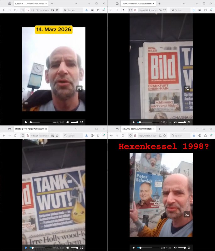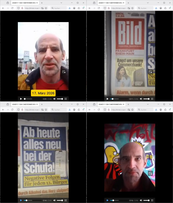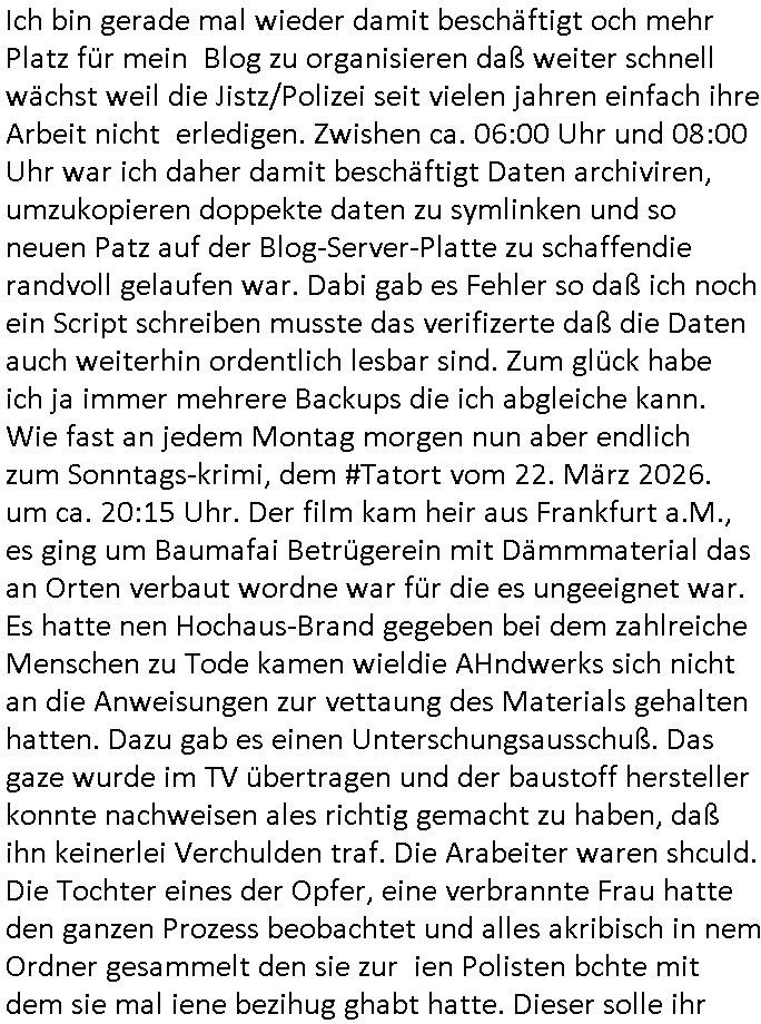 | Ich habe gestren repeoektve heute bis um 02:30 Uhr in der Früh Systeme konfiguriert und bin deshalb nach nicht mal 5 Stunden Schlaf erst nach 07:00 Uhr wachgeworden umd annwietrzuchen bis zimlch exakt um 14:00 Uhr und da war ich dann endlich soweit fertig mit den Sabotage bedingten umfagrichenren rbeiten zum Monatsanfang als sonst üblich. Dafür hab ich diese ACME - Bot SSL Sache noch fertigbekommen von dem Fax - Serversystem von dem ich berichtet hatte das ich Demonsttationszwecke- bei Gericht wegen maluafgbaut hate und mit umziehen musste als ich den Provider in Oseuropa whcslte wo es in letzter Zeit häufig Ausfälle gibt die eines meienr Backup - Systeme ( etwa dei http://193.19.133.9:8080 ) betreffen. Daher komme ich nach zeoStunden erschöpf-ungbdinger Ruhepause erst jetzt dazu kurzwas zu dem #Tatort Krimi vom Sonntag den 01. März 2026 zu schiben. Der fing später an, es gab eine Brennpunkt oder sowas sonder-sendung weil im Iran der Krieg ausgebrochen ist mit den USA. Als es dann losging bekam ich nur soviel mit daß es umien Frahradkurier ging der zur Polzeistation kam um ne Selbstanzgezu machen aber dann irgendwie wieder weg-gschickt wurde udn dann vor dem Gäde von einem Auto überfahren wurde,wohl mit Absichht. ICh dcheterst den Film habe ich schonmal gesehen weik es schonmal was gab mit Fahradkurieren und den EDV - Daten von denen anhand derer man sich Hinweise erhoffte auf die Täter. Schon damals ging es um irgendche "Scanner".