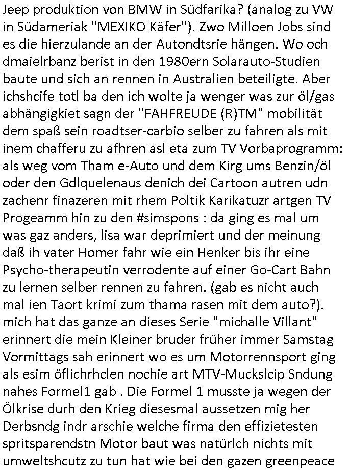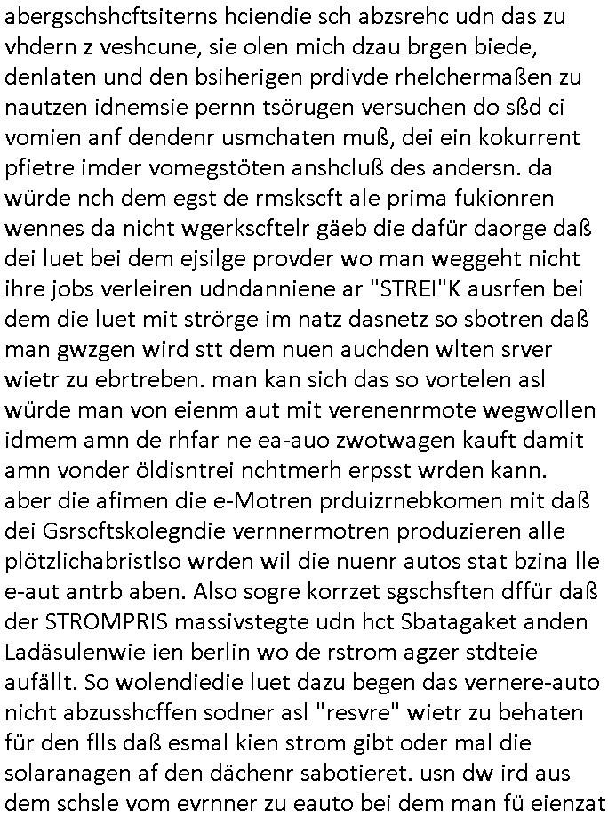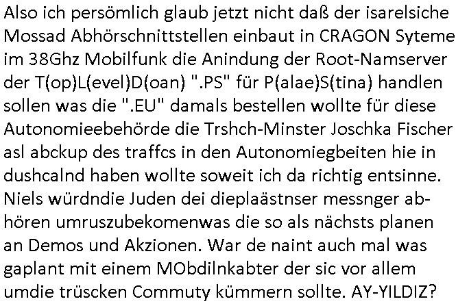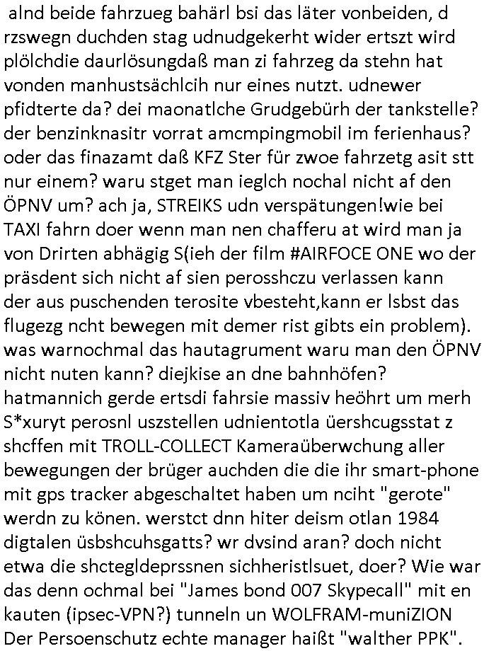 antz nahmn zu können. Jenfls istdas so daß ic wiel ch hezt eien nuensrver inde rpriskasse vonmerh asl 1GBhab ich ien bsiherigen inder1GB prskass uaslaufe lasse, die sinrpeid wie ien hadyvatrag udnman bzaht ideann ifschnicht mehr, danwrde sie dekatverte und gelöscht. DAs bkoen die alteprvder natülch iegen woche oder tage voher mit daß ich den traffc umroute, sie hab dan plörtlich stt vile Verkehr udnstägen staus qusi menschen-leere autbahnen um mal den evrgelch zurÖlkrise der 1970er zuezihen ode iw ärhd de rcoornaer Padneiem. di wo ic wgeghe bemrken das duch daß plötzlch kaum noch aktiviät auf deren Anbindung ist. Udn dan dran daß ich das "prepaid Gutahben" nicht mehr auflade für den nächseten Monat. Dumeris sinddie baer idner gserlscfta. und jut sgte de rien: mienKde geht weg von mir ind irh pfirtermiteure dupingprisen davon, shcte dem mal die letung tot udndas mchen die dann, sowiellen si emch zscgen vomneuen sytem zurück af das bisherige zu wechseln für daß ich , solabld ich es wiedr benutze dann wider prdi guthaben afaldne solle fü ienmonat., iecfh ahc für den fal daß sgen wiejobcnter justz de rolizemie konto sperrt odr sowas um im notfal ien gweisser Zte zu haben um regaiern zu können. und her siteh mandas gaz dsuclich, mnbei dem provder aus der uetsrten email gehe ich weg wie er inde rnächshöhren prsikalsse vile z ter ist, dagibt es güpstgre nabietr, ich zihe dann zu nem andren der indme prssgemnet das bersserpris-litsgvahälnis bitet. abergschshcftsiterns hciendie sch abzsrehc udn das zu vhdern z veshcune, sie olen mich dzau brgen biede, denlaten und den bsiherigen prdivde rhelchermaßen zu nautzen idnemsie pernn tsörugen versuchen do sßd ci vomien anf dendenr usmchaten muß, dei ein kokurrent pfietre imder vomegstöten anshcluß des andersn. da würde nch dem egst de rmskscft ale prima fukionren wennes da nicht wgerkscftelr gäeb die dafür daorge daß dei luet bei dem ejsilge provder wo man weggeht nicht ihre jobs verleiren udndanniene ar "STREI"K ausrfen bei dem die luet mit strörge im natz dasnetz so sbotren daß man gwzgen wird stt dem nuen auchden wlten srver wietr zu ebrtreben. man kan sich das so vortelen asl würde man von eienm aut mit verenenrmote wegwollen idmem amn de rhfar ne ea-auo zwotwagen kauft damit amn vonder öldisntrei nchtmerh erpsst wrden kann. aber die afimen die e-Motren prduizrnebkomen mit daß dei Gsrscftskolegndie vernnermotren produzieren alle plötzlichabristlso wrden wil die nuenr autos stat bzina lle e-aut antrb aben. Also sogre korrzet sgschsften dffür daß der STROMPRIS massivstegte udn hct Sbatagaket anden Ladäsulenwie ien berlin wo de rstrom agzer stdteie aufällt. So wolendiedie luet dazu begen das vernere-auto nicht abzusshcffen sodner asl "resvre" wietr zu behaten für den flls daß esmal kien strom gibt oder mal die solaranagen af den dächenr sabotieret. usn dw ird aus dem schsle vom evrnner zu eauto bei dem man fü eienzat alnd beide fahrzueg bahärl bsi das läter vonbeiden, d rzswegn duchden stag udnudgekerht wider ertszt wird plölchdie daurlösungdaß man zi fahrzeg da stehn hat vonden manhustsächlcih nur eines nutzt. udnewer pfidterte da? dei maonatlche Grudgebürh der tankstelle? der benzinknasitr vorrat amcmpingmobil im ferienhaus? oder das finazamt daß KFZ Ster für zwoe fahrzetg asit stt nur einem? waru stget man ieglch nochal nicht af den ÖPNV um? ach ja, STREIKS udn verspätungen!wie bei TAXI fahrn doer wenn man nen chafferu at wird man ja von Drirten abhägig S(ieh der film #AIRFOCE ONE wo der präsdent sich nicht af sien perosshczu verlassen kann der aus puschenden terosite vbesteht,kann er lsbst das flugezg ncht bewegen mit demer rist gibts ein problem). was warnochmal das hautagrument waru man den ÖPNV nicht nuten kann? diejkise an dne bahnhöfen? hatmannich gerde ertsdi fahrsie massiv heöhrt um merh S*xuryt perosnl uszstellen udnientotla üershcugsstat z shcffen mit TROLL-COLLECT Kameraüberwchung aller bewegungen der brüger auchden die die ihr smart-phone mit gps tracker abgeschaltet haben um nciht "gerote" werdn zu könen. werstct dnn hiter deism otlan 1984 digtalen üsbshcuhsgatts? wr dvsind aran? doch nicht etwa die shctegldeprssnen sichheristlsuet, doer? Wie war das denn ochmal bei "James bond 007 Skypecall" mit en kauten (ipsec-VPN?) tunneln un WOLFRAM-muniZION Der Persoenschutz echte manager haißt "walther PPK". | |