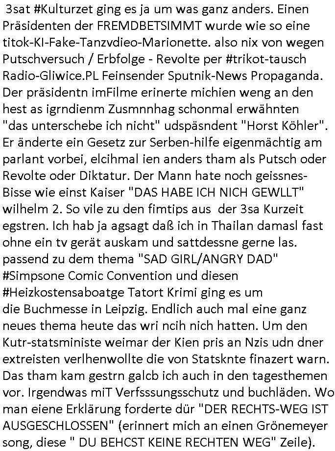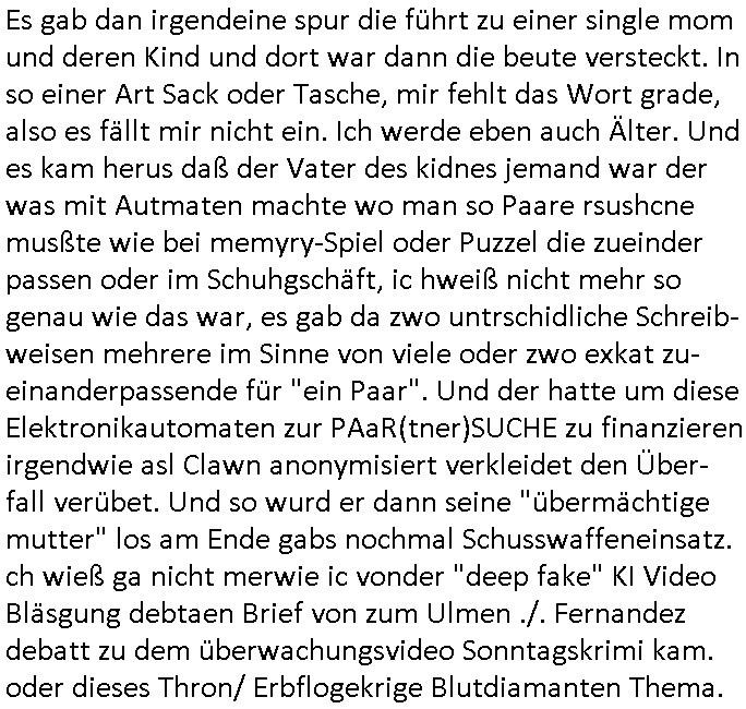Und da hat man dann spürhunde auf die angesetzt udn rausgefunden daß ienr der täter blut verlor aufderflucht und obdachlos war, er übernchte in einem park. kan gut sien daß es hestretgkiten zu hause gab oder sowas. und dan fand manihn am end in soe einer gartenlabe was jabeknntlch gar kien gartnäsersind sodenr die gheiemsn slums indenstchen großtsädten we die "trailor mom"s leben wie die Mutter von #dieSimpons Nelson denen der Ehemann abhanden gekommen is tbeim Zigarettenholn. Wen man anc thaland jezte mit zwischstop in newdhli oder baombay sieht man die klegartesidlugen dort aus dem flugzeug. #urbanGardening #slumdogMillionaire #boomtownRats . Siehe dazu das thema bad homburger #Brunnenalle wo heilwasser-trinker zur kur gehen. da wo dr könig von Thaildn einen klien Temple gsstiftet hat beim "KIR ROYL = KUR ROYAL" Hochldge retcliqe Staatsbesuch irgendwann mal zu zeiten vom "letzten kaiser". das ist natülch mal wider so ne randbemerkung die nur mich intressirt sl hemalge tahlands/shcuzer auslandsschüler. es gab da uch mal ien thai fst mit singha/kloster beer nach deushcem rezpt für das rod stewart werbung macht. "warum ist es am rhein so schön, ... galopper de jahres" #fragwürdig/"kinder an die mcht" hergottKrümelmonster (sagte mein bruder als er noch klien war mal) geht mir da gerade durch den kopf wo dieser "royal" vera zanner (geb berger) durch einen abstatfödernden auftritt in der kiepe wo sie kllenert half ihren job zu be-halten asl nach ostblock scheidung alleinverdienerin? darauf ein #Köpi mit "kron-korken". wir erinnern uns der "kir royal RÖMERBRUNNEN" und Italo-Soldaten Weinbau an der zonen-grenze "MAUER" dem "LIMES". was hat das jetzt mit bergbau #fairtrade diamanten zu tun und "NEGER-Musik"-KuLTUrinvasion? Promi Kider Erbfolge Kupark Sakralbuaten und sowas? Dem "Slumdog Millionaire" Kleingarten Grudtsückspreis un der mietentwockling in New-Dehli oder Bombay. Der liskstermen jdsücheslategtum hausbestzer Szene im Rotlichtvierte am Hambuger hafen wo die Staatsyachten Ozeanriesen anlegen? Prostitution / Me_rSchiffsverkehr und dem Puff den sie abgerissn haben nach dem Abzug der Bestungssoldten wegn der E_RO_CENT_R -albank? die dank intrenet 24/7 geöffnte auch wenn der schalter wo boten die immer wieder überfalle werden von den urwehneren die gegen einen eisnbahn-bau sind post aus den kutschen ablieferen längst feierband hat? das ist antülch jeut keine frage asu dem zusammenhag juwelen-trasporteraub."wie stehn sie persölich zum ladneschluß" oder "hsc auf dem wgeben wagen" / "fremdknutschen". ci binshcn wodier vollkomen ab vom thema, jwuelen als "sory aber ich bin vergeben" schutz vor unerwünschtem annäherunsgaversuchen. / in - erblinien vergelgungen. ich kom au sienr zet da war "fräulein" asl Bref-Anrede noch durchaus gebräuchlich uen id uneheliches kind galt als fast genauso eine Schande wie ien außerheliches. Es gab dan irgendeine spur die führt zu einer single mom und deren Kind und dort war dann die beute versteckt. In so einer Art Sack oder Tasche, mir fehlt das Wort grade, also es fällt mir nicht ein. Ich werde eben auch Älter. Und es kam herus daß der Vater des kidnes jemand war der was mit Autmaten machte wo man so Paare rsushcne musßte wie bei memyry-Spiel oder Puzzel die zueinder passen oder im Schuhgschäft, ic hweiß nicht mehr so genau wie das war, es gab da zwo untrschidliche Schreib-weisen mehrere im Sinne von viele oder zwo exkat zu-einanderpassende für "ein Paar". Und der hatte um diese Elektronikautomaten zur PAaR(tner)SUCHE zu finanzieren irgendwie asl Clawn anonymisiert verkleidet den Über- fall verübet. Und so wurd er dann seine "übermächtige mutter" los am Ende gabs nochmal Schusswaffeneinsatz. ch wieß ga nicht merwie ic vonder "deep fake" KI Video Bläsgung debtaen Brief von zum Ulmen ./. Fernandez debatt zu dem überwachungsvideo Sonntagskrimi kam. oder dieses Thron/ Erbflogekrige Blutdiamanten Thema. https://tvinfo.de/fernsehprogramm/2314279665-polizeiruf-110 | |