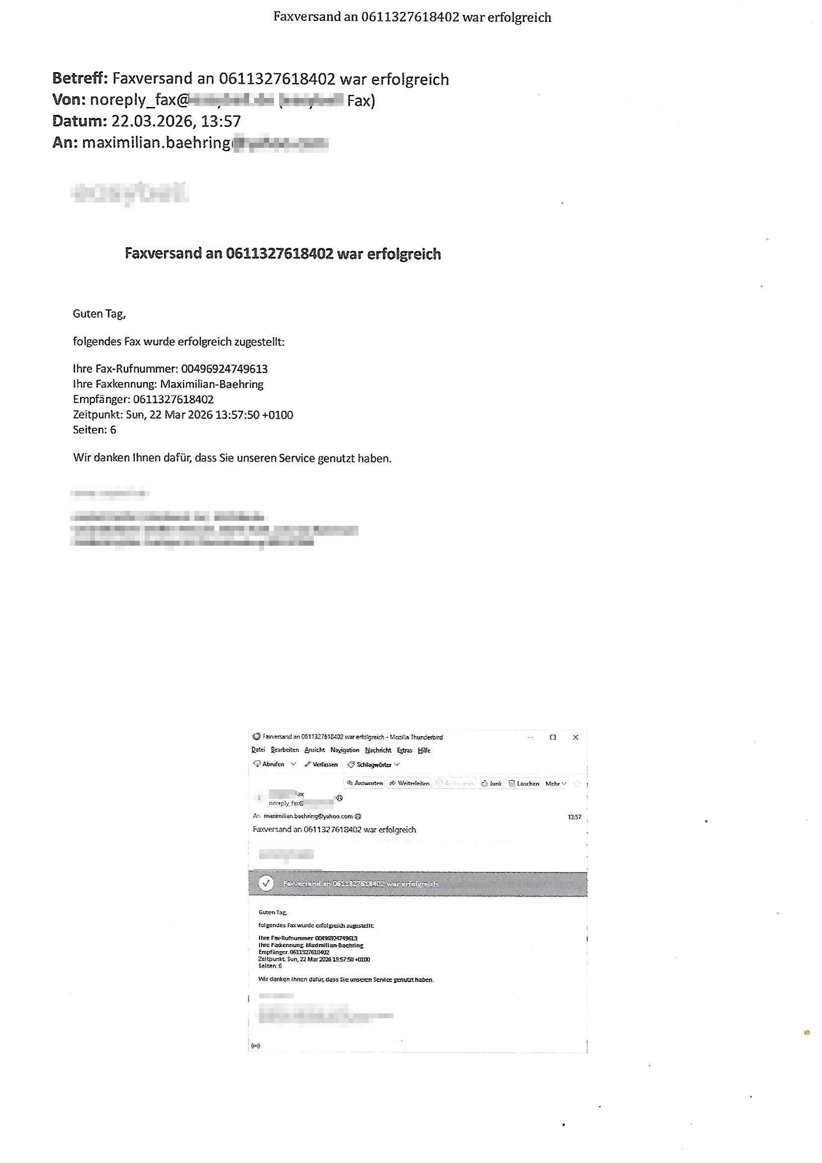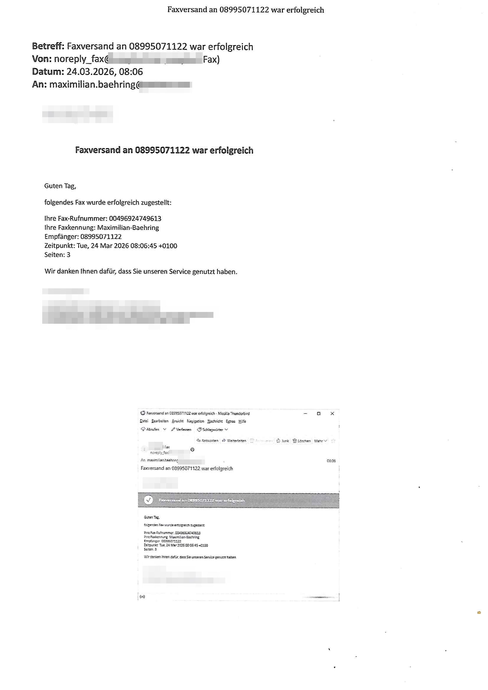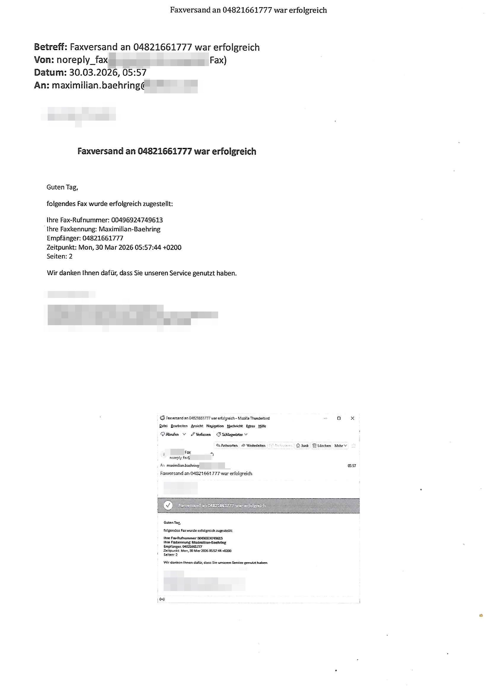 Betreff: Faxversand an 04821661777 war erfolgreich Datum: Mon, 30 Mar 2026 03:57:44 +0000 (UTC) Von: Fax <noreply_fax@> An: maximilian.baehring@ Web2Fax Faxversand an 04821661777 war erfolgreich Guten Tag, folgendes Fax wurde erfolgreich zugestellt: Ihre Fax-Rufnummer: 00496924749613 Ihre Faxkennung: Maximilian-Baehring Empfänger: 04821661777 Zeitpunkt: Mon, 30 Mar 2026 05:57:44 +0200 Seiten: 2 Wir danken Ihnen dafür, dass Sie unseren Service genutzt haben. | |