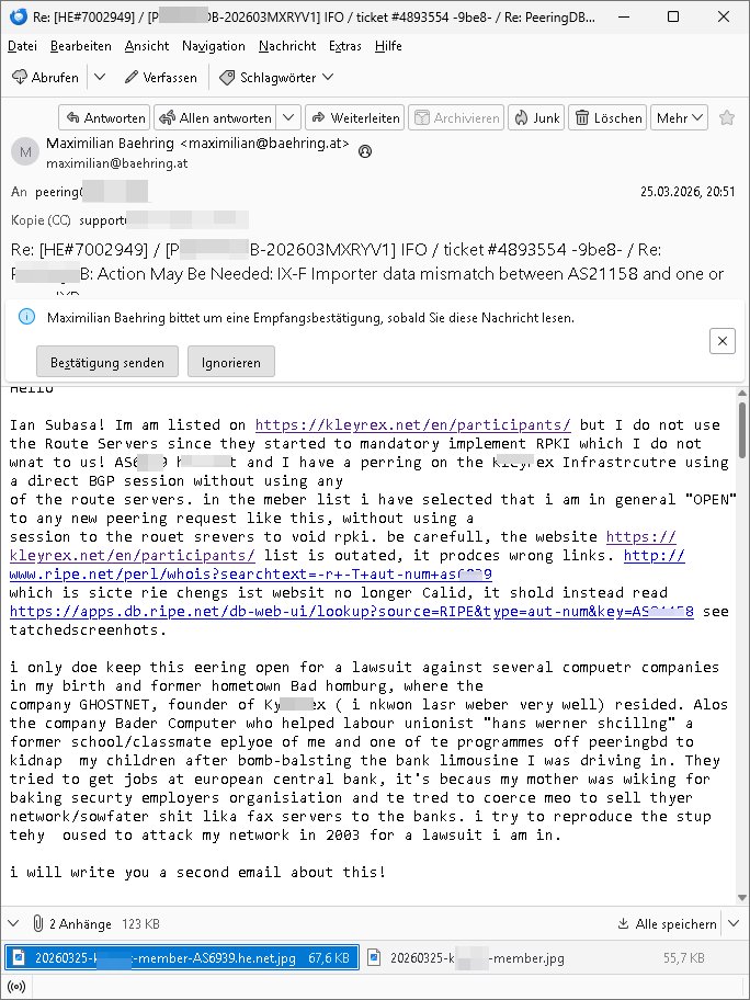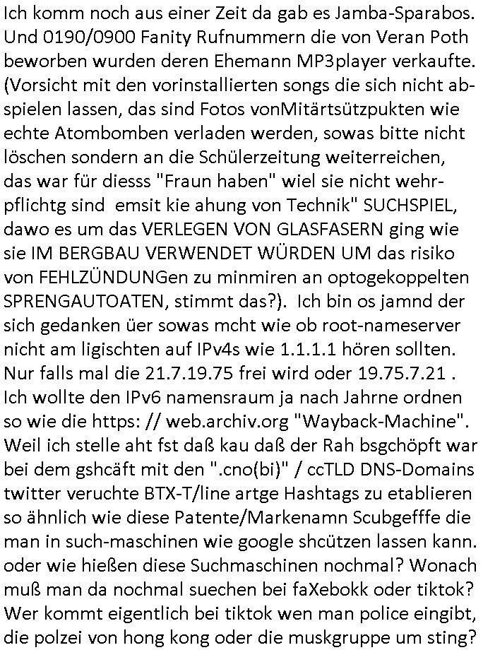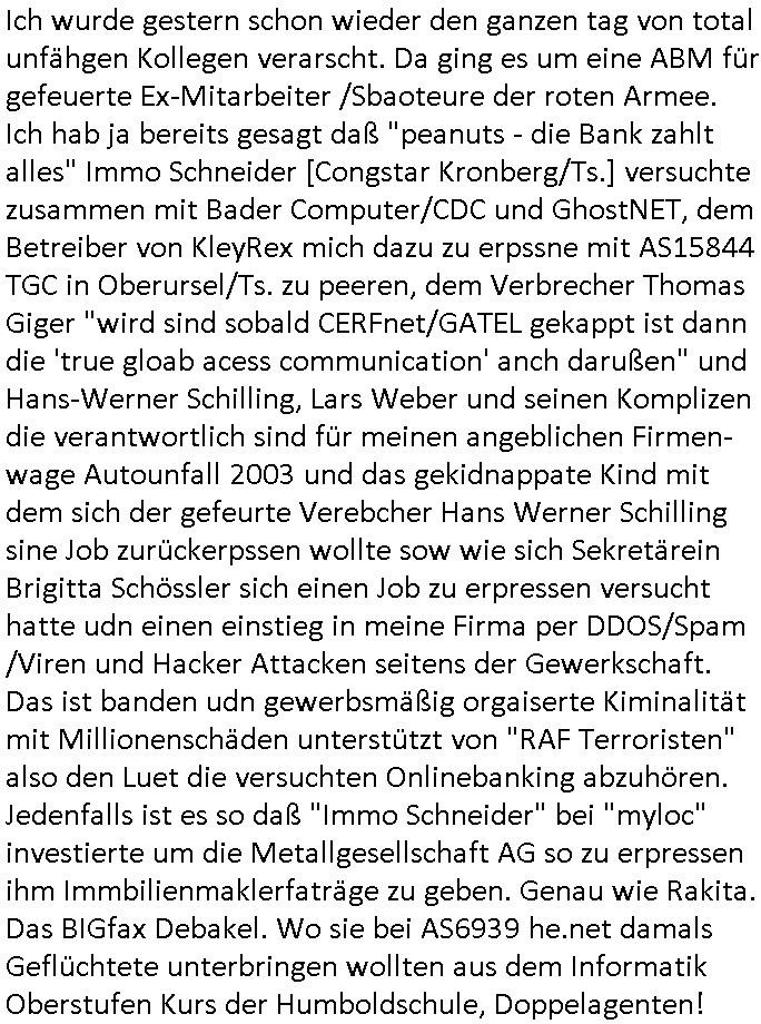 GOOGLEmail abspalten wollte) AS12586 mit Sitz in FFM gegründet in Bad Homburg. Der SysOp soff öfers inder Cubano bar wo die Banksicherheit-Yugo-Nutten von IBM (siehe auch MAINOVA webHOUSE HanauerLand- 19X Claranet/leasedweb nähe Rechenzentrumslokation mit direkter Verbindung nach "ibm.de" = BÖBLINGEN) mir von kdipapern meines entführten Kindes berichteten. Passend dazu hatte auch das "DUFF Bier" maskottchen (quarterbock: "centerField" wie "ZENTRALgELD"-server) Sorchetproblem im Show-Wahlkampf Sieh bewerbung von Verbrecher-Kukie-Vgerlger-Mörder Flo Bruckmaier für ämter in Judgparlmant/Schülerzeitung/CDU partei). Worum ging es sonst noch? am gstregn TV- Vorband? Ich muß mir das ja immer ansehen wegen dieser "onkel Dagobert grüsst seine Neffen qusi live vom Gladbecker Geiseldrama als siet ### tagn Gefangener der RAF" Dinge die imemr in den Sendungs-Beiträgen versteckt sind und die ich gezwunge werde auszwerten per diesem Blog hier mit entführtem Kind (tabea-Laar Riek *19.09.2000, HG siehe http://tabea-lara.blogna.me daß dort nur üer die sktenzugehörgkiet iher mUter was steht nicht aber über das kidpping hat damit zu tundaß ic ahrlang svscht das Kind per Umagsn/sorgerechtsverfahren zu "befreien" ohe daß es die grasem wahrheit über siene Ensthung oder Mutter erfährt). Es ging um "BIGfax": eien Kneipe für (vagalger HOMOs wie Klurklink hausmeiter Hett und sein Kumple C***kovic die wie Türken-Spion-Schulhaus- "meister" Nikic miteinander die Arbits-Plätze tauschn wollten) vor der JOE seine MARIHAUNA affine Enkelin einsammlete hatte im Rgebogenfahne Schaufenster ein drucken/kopieren/ cannen udn FAXEn senden schild für multifunkZIONs (netzwerkfaxserver) speicherFAXgeräte! Malte will nach Thailand: vonden afts 200 Nationen auf der Welt geht es in der Serie ausgrchnet um jene in der ich zwoenhalb jahre Auslandsaufenthalt hatte udn zur Schule ging (Lehrer wie UGANDA - basti / DUBAI - tom). So wie mien ExFreundin versucht man die loszuwerden indem man sie in PschoTherpien hineeiub-mobbt/stalkt. Fats wi das inden Suizd hetzen bei mir an dem sich eine Frau vera zanner, (geb BERGER) beteilgt wie man bis 2020 nachslen kann und BERGER hate auch mit BIGFAX zu tun on BADER COPEZER und ist bekanntlcih pleite nachdem klar war daß EDV Fxe derart manipulierbar sind daß man auch gleich eine "geshotshopte" Email versnden kann., nur daß man da nicht af die wnger asl 64Kbit/s pro ISDN kanal bei G3 faxen heruntergedrosselt wird. BERGER ist total Pleite, das Finazmat ist ihm auf den Versen aber er sposrt Chiar udn malte dennoch enien restaurantbesuch? Das erinertmich an "C***kovic"/vera "BERGER"s umfeld um Trcibetügerin Andrea RESs/e)LERdaß inder CUBANO Bar neb dem Hxnkssel am Untetor Polterabn Parys warf die aus deneinahemn von Zangs-Ehen mit Millonären finzert wrden sollten. Luetn die bei der "new economy" (hört sich wie Tickt-Sytsm nch Start - Amadeus http://fLÜGe.de Lufthansa Airline Portal an) reich wurden. hab ich eigentolch eräht daß es bei den Simpsons mal wider BIERTRINKEDE #Eifel65 Piloten gab? Vom "TORNADO-D(ata)C(enter)" DK(lime)RZ/BFS Langen mit seinen (der Zoll hat H[ewlett]P[ackard] Clustern und dem MASSIV-PARALLELEN Knacken von Check-summen, siehe Uterschd zwischen 56/128 Bit SSL Exportrestriktion) auf das ich irgendwie über "THAILAND - THERAPIE" in #berlinNeuKölln02407 / #berliTagundNacht kam (siehe thema #tatort KOMISSRA "MRT NAZ<KUR" #SPY-GAME [der kino-film] entführung- flüge in das TRIXIE-DÖRFEL (#köln504711) KLINIK-PARADIES patietenzimmer PayTV) nun mal zuwas ganz anderm als meinen Zeiten im Judgen Parlament und der Schülerzeitung: es ging weiter mit der 3sat #Kulturzeit woe mein hemlge mistschüler asud des abd hombruer Humdilschue abi jahrgang 1995 Chrisitian #Metz denLietrukritiker spielt.Die sndung mit der frau BRUNNE(R) wie mord-BRENNER oder BRUNNEN also Trink-KUR QUELLE/QUaELEn - Kurbetrieb Betriebsrat zwecks jobverlust-vermeidung im Klinik Pleitebetrieb i Bad homburg wählen! Wie heißt nochmal der Chef vom Rechztentrum DeCIX eG "SPIES"? Wie Klinik Baumstark Chefin oder diese Pantomsn-Brüllaffen Milärausbilder sdie lsbternanten im Sanitötsdinst - zescghutz für Vergewaltigunsgopfer "es gibt kien männlchen oipfer"? Wiekopmm ich jeutzt nur af die Verbidungshcen shcüler-zeietung und Bduspäsdinet mit Schulschff Staatsbesuch Bangkok/THAILAND militär? Wie komme ich auf Spioage des Hausmeisters der aufder sch nch Kidpping Löse-gedler die er veturrene kan Post für Redakteure wie mich klaut auf Militär? Ach so: angeblich ist Kireg im Iran. Hat jemad z_RAN und IRAN und DEN VER->RÜCKTEN IvAN vertauscht (ausgetauscht wie miteinander verwechselt)? Was hat sponage mit amgfanger (pds-fax)post wen es um berichet asu Kiregsgbietn für dei shcüerzung geht nur mit der 3sat kurzet zu tun udn chstin metz der damsl mit mir zusmen üper das herrasuen atteta berichten sollte mich aber damiter exusivstry iehamen bekomt erpresste? ach ja, "KRIEG IM IRAN". Trump hätte auf seinem NAH-OST Kreuzug den Ajah,TOLJah,CmOMeiNi-sten jenem Angriff den er mit ISRAELs rohstoffhungrigen ZIONisten zusammen geplant hat welchd ei Plästinsre um ihr land betrügen wollenso wie TV-terror-Clown Jude SELENSKYI im Nordn das NAHEN OSTEN, dem SÜDEN RUSSLANDS veshcte den ÖL/GAS Enrgiamrkt so neu zu ordnen daß Moaku nicht mer mitverdient das deshlab eigeen Pipe-lines baut GAZRPOM/NORTH-STREAM damit nichtdue Ikarenr Europ wider DEVISNbrger Gas-hanh zudrehen? Wie finanziern die Ukarienr nochmal ihre waffen für den Sepratismuskmapf der atomaern Kirm Schzemeer-flotte von der UdSSR? Mit Enahmen ausfs Patenetn-Verküufen für effizite batreien aus Atom-U-Booetnder Oten armee?Jedfalls olen die mschen in europ gajubet haten als der rliös Füher endlch tot war, erinert mich an das Jubeln von barak Obama im"Sitauion Room" als man "osam bin abden" emrodert hat desn stebrlche üerreste man an einm gheiemn Ort dem Meer übergab dmeit kein Wall-fahtsort für Märtyer snteht wie bei dem "SISSI"/"