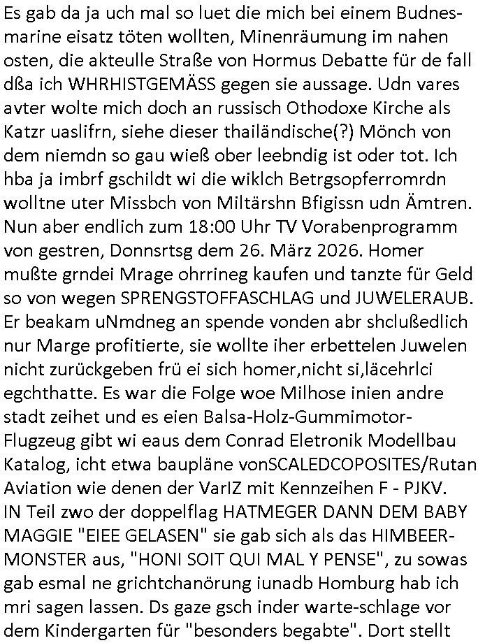 | Dies gazen sgchtzretne existnezen, was die nur hätten er-reichen können, den Sieg im Kapf gen den islam-ismus im dritet wnelkrge, wennsie zum heldentod im Kampf an vofodertser Font bereit gewesen wären statt als Zivis rumzugammlen. genau wie bei den suizidentne all dies SINNLOSE UND vollkommen ÜBERFLÜSSIGE sterben, per üerbabitung hertzinfarkt am arbeistplatz oder sowas statt wi seinerzet der füher "in Ausübung seiner Pflicht". jetzt aber zu etwas ganz anderem: nälich dem 18:00 Uhr TV-Vorbandprogramm von Montag, dem 30. März 2026. Bei den #Simpsons (hatte ich nicht eben über die Folge BARTIFICIAL INTELLGENCE gesprochen, Roboterschrott der weiterlebt weil er "recyclet" wird, programme die "den geist" des alten computers auf den neu üteragen?) ging es um den Spüldienst in einem Ferienlager und die wunderwerke der 3D-Drucke Zahntechnik. Ic hate irgndo noch einen alten Gipsbduck für die Zahnspang die ich eiegentlch gar nicht so nötige gebraucht hätte wie die Kidnapper gang vom Jugendamt bad homburg diese "Emma" joursuten in ober-Erlenbach lebte an der zehnt- scheune und das Rasenmähen sl iderbate verteuflete. Der mit dem sohn oshn mit der "feuchten Aussprache". Der sich so sehr für Zahnmedizin Forensik interessierte. Und schwerst illegale Beweiserhungsmethdik so von wegen DNA-Vaterschaftsfeststellung in 9F 104/01 KI Amtsgericht Bad Homburg v.d. Höhe. Wo ermien akte mit derien Afiskchen Dogendeler (vegerlger) jukies vstschte