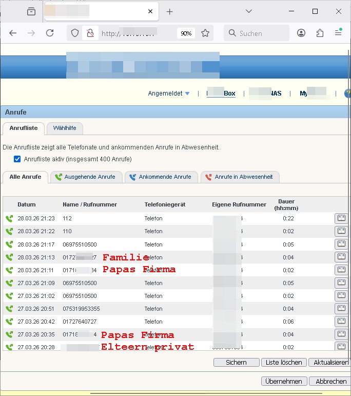 28.03.26 21:23 112 0:22 28.03.26 21:22 110 0:02 28.03.26 21:17 06975510500 0:05 28.03.26 21:13 0172*** 0:04 Familie 28.03.26 21:11 0171*** 0:02 Papas Firmenhandy 27.03.26 21:09 06975510500 0:05 27.03.26 21:02 06975510500 0:02 27.03.26 20:51 075319953355 0:04 27.03.26 20:42 0172*** 0:06 Familie 27.03.26 20:35 0171**** 0:04 Papas Firmenhandy 27.03.26 20:28 07732*** 0:02 Eltern 27.03.26 09:15 110 0:01 27.03.26 09:01 112 0:01 26.03.26 20:52 0172*** 0:02 Familie 26.03.26 17:37 0171*** 0:04 Papas Firmenhandy 26.03.26 17:36 0171*** 0:01 Eltern 26.03.26 10:16 069*** 0:01 26.03.26 07:02 089*** 0:01 24.03.26 21:34 06975510100 0:05 24.03.26 21:33 06975510500 0:01 24.03.26 21:32 06975510500 0:01 | |
