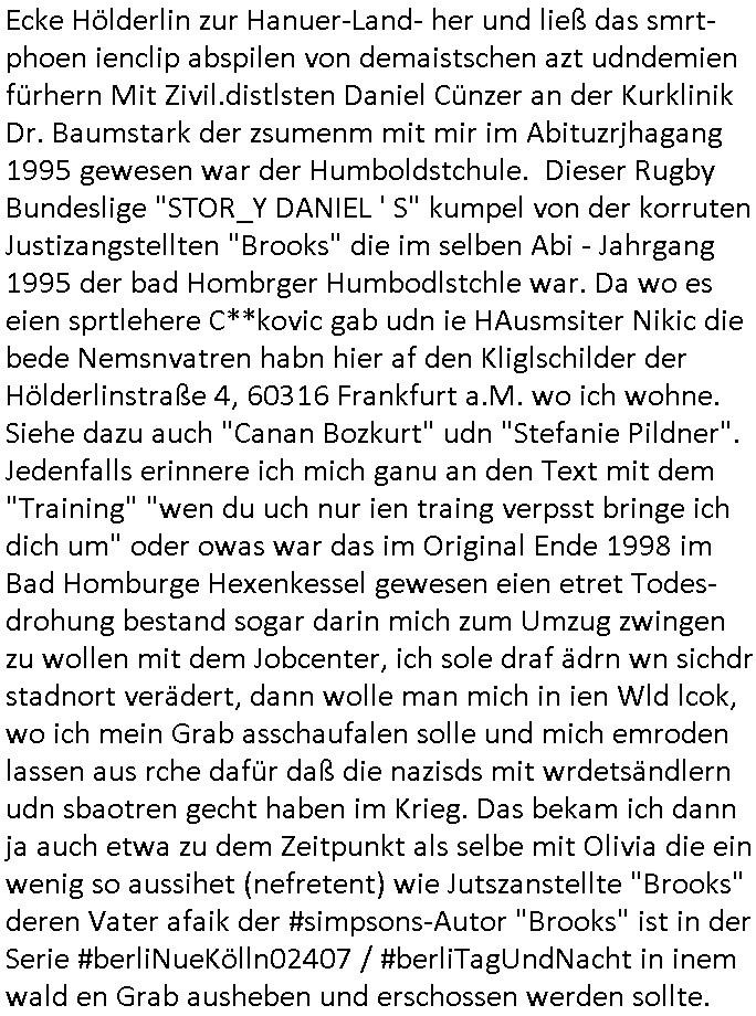 Ecke Hölderlin zur Hanuer-Land- her und ließ das smrt-phoen ienclip abspilen von demaistschen azt udndemien fürhern Mit Zivil.distlsten Daniel Cünzer an der Kurklinik Dr. Baumstark der zsumenm mit mir im Abituzrjhagang 1995 gewesen war der Humboldstchule. Dieser Rugby Bundeslige "STOR_Y DANIEL ' S" kumpel von der korruten Justizangstellten "Brooks" die im selben Abi - Jahrgang 1995 der bad Hombrger Humbodlstchle war. Da wo es eien sprtlehere C**kovic gab udn ie HAusmsiter Nikic die bede Nemsnvatren habn hier af den Kliglschilder der Hölderlinstraße 4, 60316 Frankfurt a.M. wo ich wohne. Siehe dazu auch "Canan Bozkurt" udn "Stefanie Pildner". Jedenfalls erinnere ich mich ganu an den Text mit dem "Training" "wen du uch nur ien traing verpsst bringe ich dich um" oder owas war das im Original Ende 1998 im Bad Homburge Hexenkessel gewesen eien etret Todes-drohung bestand sogar darin mich zum Umzug zwingen zu wollen mit dem Jobcenter, ich sole draf ädrn wn sichdr stadnort verädert, dann wolle man mich in ien Wld lcok, wo ich mein Grab asschaufalen solle und mich emroden lassen aus rche dafür daß die nazisds mit wrdetsändlern udn sbaotren gecht haben im Krieg. Das bekam ich dann ja auch etwa zu dem Zeitpunkt als selbe mit Olivia die ein wenig so aussihet (nefretent) wie Jutszanstellte "Brooks" deren Vater afaik der #simpsons-Autor "Brooks" ist in der Serie #berliNueKölln02407 / #berliTagUndNacht in inem wald en Grab ausheben und erschossen werden sollte. Acuhdei Figur der "niger politesse" Carla hat eine Ent- sprchung in der sire, sie ist dei Figur aus dem"soul food" imbiss in der #Simpsons Folge mit der #blutwäsche und der Gürtelschnalle woeHomes saufkumpan Carl erfährt daß er als Kind vonsie letren weggegeben wurde. So ne ndummriste stry wolltensi mri ja auch erzählen damals. Da habe sie ja ch die rmodung meiner Eltre angedroht. Jedenfalls reagierte man prompt als ich zu "RUST wie auf dem Europaparkplakat ist eine Programmiersprache" gestren zu "KUR ROYAL BAD HOMBURG = KIR ROYAL" was sagte, Kurbetriebe Bad Homburg "Kurdirektor" Sohn "Florian Buckmaier"s Skandreporter "baby Schimmerlos" Spesenabrrchnugen (DIE GIBT ES WIRKLICH,ALS BEWEIS BITTE VORLEGEN) aus dem "RÖMERBRUNNEN"im Kur-park erstaurant von (Quidt Stftung OB Verwandschaft) ASSMANN - siehe auch die "AKK-Kanzlei" asu dem Ver-fahrn um denzrakten BZn die horrne Gbührenfür das eiscann der Akte zur richte haben wollten das ich nicht beauftragt hatte. "AKK" heisßt "ASSMAN KLASSE KOCH". Das sind alle Rachakte dfür wen den die buchhaltung zu Rchte eien strch duch die Rehcnuge gemacht hat. An mir als dem Chefsekretärin Scihshistdienste Sohn. Das betrifft auch die Drohungen durch Palästinenser denen ich am späten nachmittg des 27. März 2026 ausgesetzt war, das ist Schmeirentehater das Andrea Ressler (Hxenkessel)organisiert wurde. Wo der typ indemstnd sagt großvatr hätten Kinder mit Nadeln malträtiert was sich auf die Verltezungen bezieht dei ich als Kidn hate mit inem Figernabl der abging nacheem ich die hand zwischen eienr Auto-Tür und dem Rhamen hatte die zugeschlagen wurde. C**kovic wollte meinen Vater als brutalen Shläger darstellen, so in den Suizid treben oder ermordene um sich dann an desn stele slebst asl Vater vonir auszugen, dfür zg de rstalker sogra hier ins Haus. Dann wolte er duch Midkmantevegauftunge erreichen daß man mich für Pfgebdefütge erklärt udnsich als mien Vormundbstimmenassn vom Amtt. Das lsbe svchte VAr Zanner (geb Bergers) leiblcher Vater (nichtder stfvater) der irgendwie mit der Frau "may" her was zu tun hat. Dabi ging es daru nicht nur jede menge Luet asu dem Osblock hier ins land zu schleusen diebahtpensolten sie seien Mitarbietr meiner lägt gshclossnen Firma (die BAd Hombuer Polzei üernham ja nch den ersten Erprssugen die Kontrolle als andre rsseer Ende 1998/Afang 1999 behaute hatet das Kidnd as sie mit ihrem Zuhälter dem Kirodrfer rocker Ulrch Rosmann hat sei von mir udnso meien Muer dazu erpssen wollte fü eiKidn zu zahlen für das wir anders als Tabe-LraRike kienrlei Abstammugs-anchwis haben), also side sollten sich asl Mitabriter ausgeben denen man keinen Lohn zahle udn nwollte C*+kov sich alsInsovlvzaverater oder sowas darstelken und imnobilieen meinr Eltren verscherbeln um ereilcheshcudlen zu decken di es gar nicht gibt,siekomen aus gefkten DDO Atctek Rchnungen. Die engung de rimmobilen Geldwäsche sollte dabei die Justizangstellte BROOKS (jetzt "Yustzsrver"?) üerbehmen. MAnwolte dei kistwerhstazmat akten üermein Zivildienst vernichten und ach sämtlche Unterlagen über meiner Erwerbs-biogrfaie tilgen bei ahsudchsucgen vondern Planugen man im Vofeld wsste, da wo katen gefleddert wurden und Festplatten geschreddert (sieh die Story mit Nigger Politesse Carla und Beweismittelvernichtung in der Srei #berliNueKölln02407 / #berliTagUndNacht), sieh die RAzzai gen dei Polzebeaten vom 1.Rveir und siehe die Verurteileung des für (BAder BIGFAx?) ED /Telco-IT Beschaffung zusädge Ober-Staatsanwats hier inFrankfurt die es real gegeben hat. Sieh rücksendung bschlagnahter Gräte duch dei StA per Post obwhlich ausdücklich draf bstndhabe ien Tremin zu r persölch ab-holung zu amchen da schonal Platen defekt zurückkamen. Genau wie bei "juwelir Zeus" damals dem Schmuck- und Gld Edelstein-raub damals extrem zetnah zu Sprgtsoddnfschlag auf Herrahsuenovn dme die ermtter sgten er hab der fluchtfizereungvop DANIELA KLETTE gediet gegen dei am OLG Celle varhandelt wird (da vahrne was ich iemr in meien brfne isn gercht wrähe, wo ich als zueg assgen solte) als mumaßlche RAF Terroistin. Bi dern vahftung hate man ja Gold edelstiene gefunden. Udn ch waffe wie die welche die KOmsuten Teroristen damsl zu kafe evrchten von Waffenscheininhabern deren Kinder Mafis unter (K.O.Dops/PAssivrach) Dogen setzten. Erinert sich nochjamdn daran was ich üer die versuchten einbrüche in Sprengstofflager vom Dshcgelmap rgabau gesagt habe, die silberen Metall Aktenkoffer mit der Aufschrift "EXPLOSVES" die im Lan