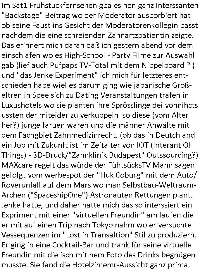 | Im Sat1 Frühstückfernsehen gba es nen ganz Interssanten "Backstage" Beitrag wo der Moderator ausporbiert hat ob seine Faust ins Gesicht der Moderatorenkollegin passt nachdem die eine schreienden Zahnartzpatientin zeigte. Das erinnert mich daran daß ich gestern abend vor dem einschlafen wo es High-School - Party Filme zur Auswahl gab (lief auch Pufpaps TV-Total mit dem Nippelboard ? ) und "das Jenke Experiment" ich mich für letzteres ent-schieden habe wiel es darum ging wie japanische Groß-eltren in Spee sich zu Dating Veranstaltungen trafen in Luxushotels wo sie planten ihre Sprösslinge dei vonnihcts ussten der miteider zu verkuppeln so diese (vom Alter her?) junge faruen waren und die männer Anwälte mit dem Fachgbiet Zahnmedizinrecht. (ob das in Deutchland ein Job mit Zukunft ist im Zeitalter von IOT (Interant Of Things) - 3D-Druck/"Zahnklinik Budapest" Outssourcing?) MAXcare regelt das würde der FühtsücksTV Mann sagen gefolgt vom werbespot der "Huk Coburg" mit dem Auto/ Roverunfall auf dem Mars wo man Selbstbau-Weltraum- Archen ("SpaceshipOne") Astronauten Rettungen plant. Jenke hatte, und daher hatte mich das so interssiert ein Expriment mit einer "virtuellen Freundin" am laufen die er mit auf einen Trip nach Tokyo nahm wo er versuchte Vessequenzen im "Lost in Transaltion" Stil zu produziern. Er ging in eine Cocktail-Bar und trank für seine virtuelle Freundin mit die isch mit nem Foto des Drinks begnügen musste. Sie fand die Hotelzimemr-Aussicht ganz prima.
