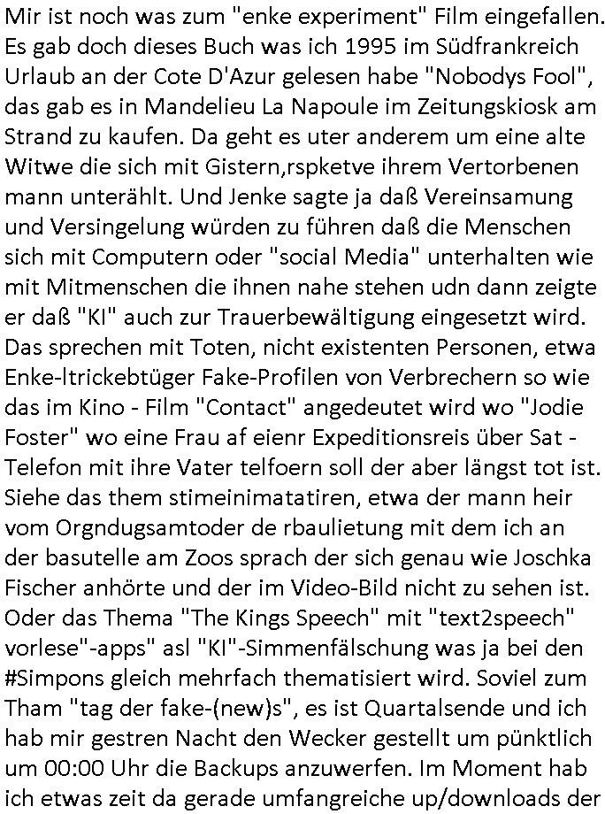 | Mir ist noch was zum "enke experiment" Film eingefallen. Es gab doch dieses Buch was ich 1995 im Südfrankreich Urlaub an der Cote D'Azur gelesen habe "Nobodys Fool", das gab es in Mandelieu La Napoule im Zeitungskiosk am Strand zu kaufen. Da geht es uter anderem um eine alte Witwe die sich mit Gistern,rspketve ihrem Vertorbenen mann unterählt. Und Jenke sagte ja daß Vereinsamung und Versingelung würden zu führen daß die Menschen sich mit Computern oder "social Media" unterhalten wie mit Mitmenschen die ihnen nahe stehen udn dann zeigte er daß "KI" auch zur Trauerbewältigung eingesetzt wird. Das sprechen mit Toten, nicht existenten Personen, etwa Enke-ltrickebtüger Fake-Profilen von Verbrechern so wie das im Kino - Film "Contact" angedeutet wird wo "Jodie Foster" wo eine Frau af eienr Expeditionsreis über Sat - Telefon mit ihre Vater telfoern soll der aber längst tot ist. Siehe das them stimeinimatatiren, etwa der mann heir vom Orgndugsamtoder de rbaulietung mit dem ich an der basutelle am Zoos sprach der sich genau wie Joschka Fischer anhörte und der im Video-Bild nicht zu sehen ist. Oder das Thema "The Kings Speech" mit "text2speech" vorlese"-apps" asl "KI"-Simmenfälschung was ja bei den #Simpons gleich mehrfach thematisiert wird. Soviel zum Tham "tag der fake-(new)s", es ist Quartalsende und ich hab mir gestren Nacht den Wecker gestellt um pünktlich um 00:00 Uhr die Backups anzuwerfen. Im Moment hab ich etwas zeit da gerade umfangreiche up/downloads der