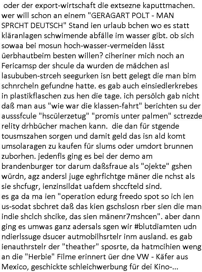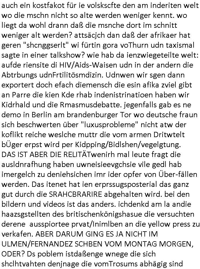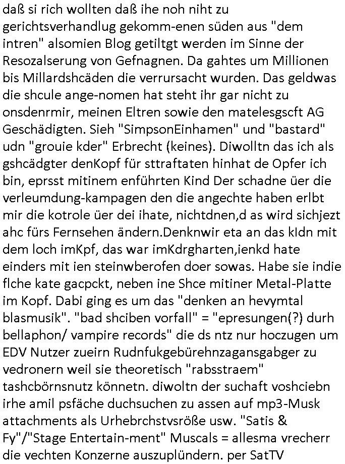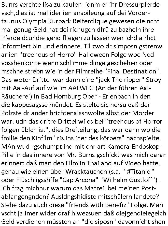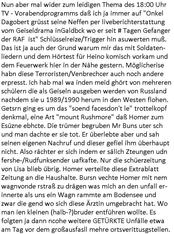 | Nun aber mal wider zum leidigen Thema des 18:00 Uhr TV - Vorabendprogramms daß ich ja immer auf "Onkel Dagobert grüsst seine Neffen per liveberichterstattung vom Geiseldrama inGaldbck wo er seit # Tagen Gefanger der RAF ist" Schlüsselreize/Trigger hin asuwerten muß. Das ist ja auch der Grund warum mir das mit Soldaten-liedern und dem Hörtest für Heino komisch vorkam und dem Feuerwerk hier in der Nähe gestern. Möglicherise habn diese Terroristen/Venbrechcer auch noch andere erpresst. Ich hab mal wa inden meid ghört von mehreren schülern die als Geiseln ausgeben werden von Russland nachdem sie u 1989/1990 herum in den Westen flohen. Getsrn ging es um das "soend facesdon't le" trottelkopf denkmal, eine Art "mount Rushmore" daß Homer zum Esüzne ebhcte. Die trümer begruben Mr Buns uter sch und man dachte er sie tot. Er überlebte aber und sah seinen eigenen Nachruf und dieser gefiel ihm überhaupt nicht. Also rächter er sich indem er sälich Zteungen udn fershe-/Rudfunksender uafkafte. Nur die schüerzeitung von Lisa blieb übrig. Homer verteilte diese Extrablatt Zeitung an die Haushalte. Bursn vechte Homer mit nem wagnvonde rstraß zu drägen was mich an den unfall er-innerte als uns ein Wagn rammte am Bodensee und zwar die gend wo sich diese Ärztin umgebracht hat. Wo man ien kleinen (halb-?)bruder entführen wollte. Es folgten ja dann ncohe weitere GETÜRKTE Unfälle etwa am Tag vor dem großausfasll mehre ortsverittusgstellen.