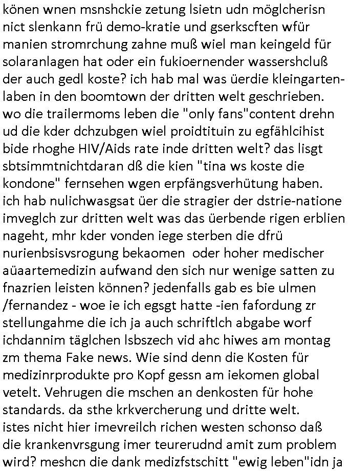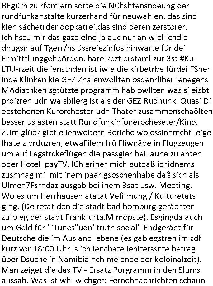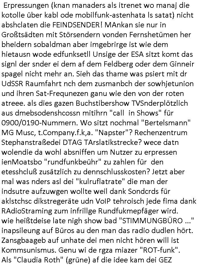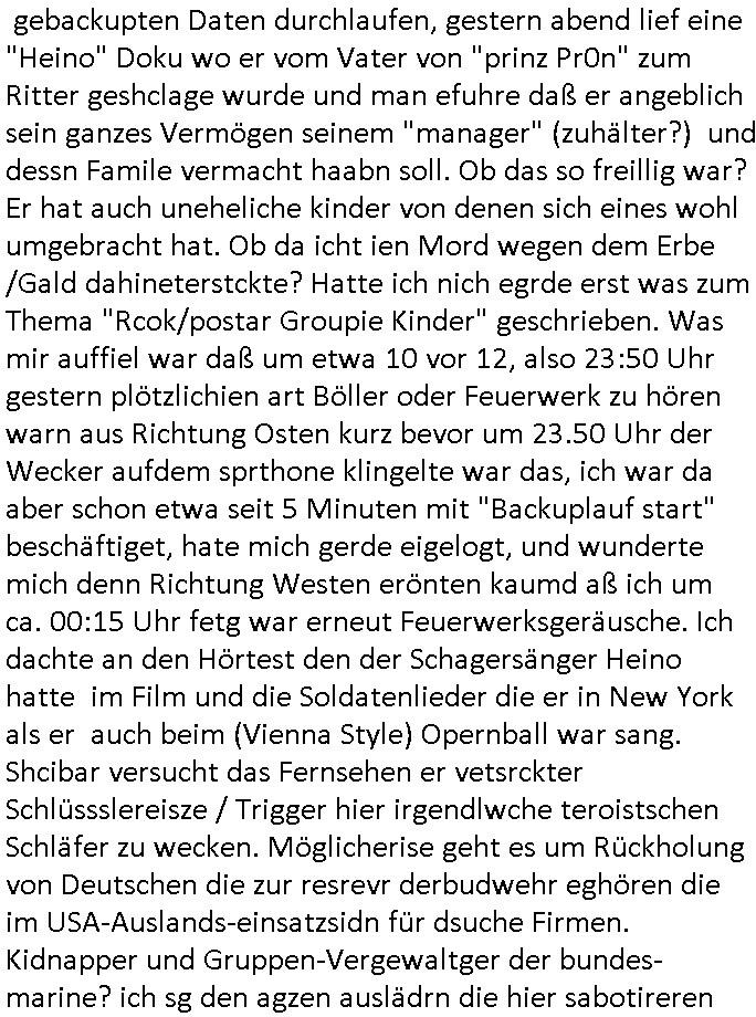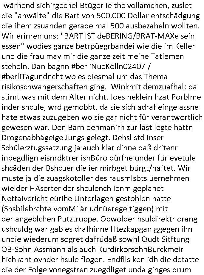 | Nun aber mal wider zum leidigen Thema des 18:00 Uhr TV - Vorabendprogramms daß ich ja immer auf "Onkel Dagobert grüsst seine Neffen per liveberichterstattung vom Geiseldrama inGaldbck wo er seit # Tagen Gefanger der RAF ist" Schlüsselreize/Trigger hin asuwerten muß. Das ist ja auch der Grund warum mir das mit Soldaten-liedern und dem Hörtest für Heino komisch vorkam und dem Feuerwerk hier in der Nähe gestern. Möglicherise habn diese Terroristen/Venbrechcer auch noch andere erpresst. Ich hab mal wa inden meid ghört von mehreren schülern die als Geiseln ausgeben werden von Russland nachdem sie u 1989/1990 herum in den Westen flohen. Getsrn ging es um das "soend facesdon't le" trottelkopf denkmal, eine Art "mount Rushmore" daß Homer zum Esüzne ebhcte. Die trümer begruben Mr Buns uter sch und man dachte er sie tot. Er überlebte aber und sah seinen eigenen Nachruf und dieser gefiel ihm überhaupt nicht. Also rächter er sich indem er sälich Zteungen udn fershe-/Rudfunksender uafkafte. Nur die schüerzeitung von Lisa blieb übrig. Homer verteilte diese Extrablatt Zeitung an die Haushalte. Bursn vechte Homer mit nem wagnvonde rstraß zu drägen was mich an den unfall er-innerte als uns ein Wagn rammte am Bodensee und zwar die gend wo sich diese Ärztin umgebracht hat. Wo man ien kleinen (halb-?)bruder entführen wollte. Es folgten ja dann ncohe weitere GETÜRKTE Unfälle etwa am Tag vor dem großausfasll mehre ortsverittusgstellen.