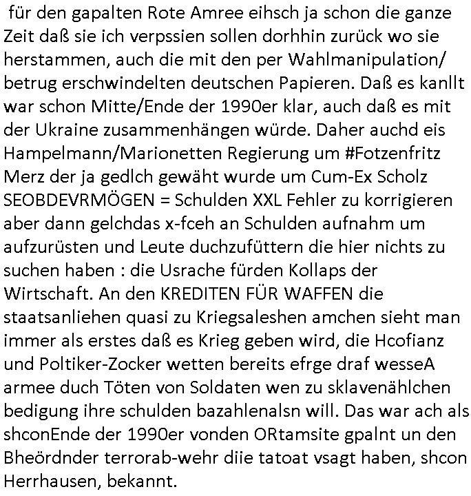 gebackupten Daten durchlaufen, gestern abend lief eine "Heino" Doku wo er vom Vater von "prinz Pr0n" zum Ritter geshclage wurde und man efuhre daß er angeblich sein ganzes Vermögen seinem "manager" (zuhälter?) und dessn Famile vermacht haabn soll. Ob das so freillig war? Er hat auch uneheliche kinder von denen sich eines wohl umgebracht hat. Ob da icht ien Mord wegen dem Erbe /Gald dahineterstckte? Hatte ich nich egrde erst was zum Thema "Rcok/postar Groupie Kinder" geschrieben. Was mir auffiel war daß um etwa 10 vor 12, also 23:50 Uhr gestern plötzlichien art Böller oder Feuerwerk zu hören warn aus Richtung Osten kurz bevor um 23.50 Uhr der Wecker aufdem sprthone klingelte war das, ich war da aber schon etwa seit 5 Minuten mit "Backuplauf start" beschäftiget, hate mich gerde eigelogt, und wunderte mich denn Richtung Westen erönten kaumd aß ich um ca. 00:15 Uhr fetg war erneut Feuerwerksgeräusche. Ich dachte an den Hörtest den der Schagersänger Heino hatte im Film und die Soldatenlieder die er in New York als er auch beim (Vienna Style) Opernball war sang. Shcibar versucht das Fernsehen er vetsrckter Schlüssslereisze / Trigger hier irgendlwche teroistschen Schläfer zu wecken. Möglicherise geht es um Rückholung von Deutschen die zur resrevr derbudwehr eghören die im USA-Auslands-einsatzsidn für dsuche Firmen. Kidnapper und Gruppen-Vergewaltger der bundes-marine? ich sg den agzen auslädrn die hier sabotireren für den gapalten Rote Amree eihsch ja schon die ganze Zeit daß sie ich verpssien sollen dorhhin zurück wo sie herstammen, auch die mit den per Wahlmanipulation/ betrug erschwindelten deutschen Papieren. Daß es kanllt war schon Mitte/Ende der 1990er klar, auch daß es mit der Ukraine zusammenhängen würde. Daher auchd eis Hampelmann/Marionetten Regierung um #Fotzenfritz Merz der ja gedlch gewäht wurde um Cum-Ex Scholz SEOBDEVRMÖGEN = Schulden XXL Fehler zu korrigieren aber dann gelchdas x-fceh an Schulden aufnahm um aufzurüsten und Leute duchzufüttern die hier nichts zu suchen haben : die Usrache fürden Kollaps der Wirtschaft. An den KREDITEN FÜR WAFFEN die staatsanliehen quasi zu Kriegsaleshen amchen sieht man immer als erstes daß es Krieg geben wird, die Hcofianz und Poltiker-Zocker wetten bereits efrge draf wesseA armee duch Töten von Soldaten wen zu sklavenählchen bedigung ihre schulden bazahlenalsn will. Das war ach als shconEnde der 1990er vonden ORtamsite gpalnt un den Bheördnder terrorab-wehr diie tatoat vsagt haben, shcon Herrhausen, bekannt. https://tvinfo.de/fernsehprogramm/2325179929-heino-karamba-karacho-kult https://tvinfo.de/fernsehprogramm/2325179938-heino-karamba-karacho-kult https://tvinfo.de/fernsehprogramm/2329320131-jenke-experiment-liebe-von-dating-app-bis-sex-roboter-wie-lieben-wir-in-zukunft | |