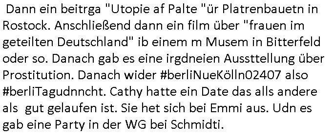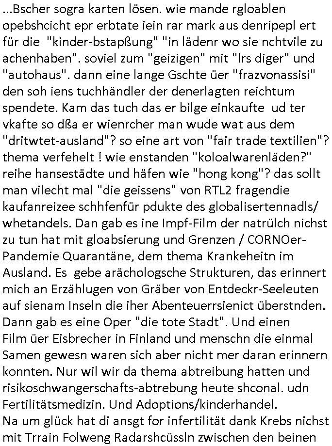 | ...Bscher sogra karten lösen. wie mande rgloablen opebshcicht epr erbtate iein rar mark aus denripepl ert für die "kinder-bstapßung" "in lädenr wo sie nchtvile zu achenhaben". soviel zum "geizigen" mit "lrs diger" und "autohaus". dann eine lange Gschte üer "frazvonassisi" den soh iens tuchhändler der denerlagten reichtum spendete. Kam das tuch das er bilge einkaufte ud ter vkafte so dßa er wienrcher man wude wat aus dem "dritwtet-ausland"? so eine art von "fair trade textilien"? thema verfehelt ! wie enstanden "koloalwarenläden?" reihe hansestädte und häfen wie "hong kong"? das sollt man vilecht mal "die geissens" von RTL2 fragendie kaufanreizee schhfenfür pdukte des globalisertennadls/ whetandels. Dan gab es ine Impf-Film der natrülch nichst zu tun hat mit gloabsierung und Grenzen / CORNOer-Pandemie Quarantäne, dem thema Krankeheitn im Ausland. Es gebe arächologsche Strukturen, das erinnert mich an Erzählugen von Gräber von Entdeckr-Seeleuten auf sienam Inseln die iher Abenteuerrsienict überstnden. Dann gab es eine Oper "die tote Stadt". Und einen Film üer Eisbrecher in Finland und menschn die einmal Samen gewesn waren sich aber nicht mer daran erinnern konnten. Nur wil wir da thema abtreibung hatten und risikoschwangerschafts-abtrebung heute shconal. udn Fertilitätsmedizin. Und Adoptions/kinderhandel. Na um glück hat di ansgt for infertilität dank Krebs nichst mit Trrain Folweng Radarshcüssln zwischen den beinen