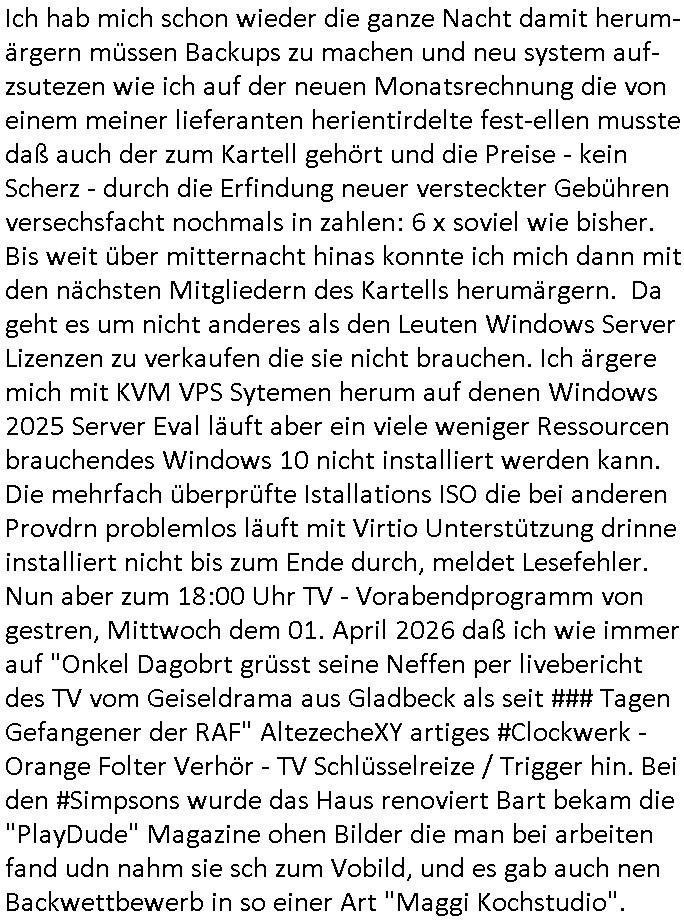 | Ich hab mich schon wieder die ganze Nacht damit herum-ärgern müssen Backups zu machen und neu system auf-zsutezen wie ich auf der neuen Monatsrechnung die von einem meiner lieferanten herientirdelte fest-ellen musste daß auch der zum Kartell gehört und die Preise - kein Scherz - durch die Erfindung neuer versteckter Gebühren versechsfacht nochmals in zahlen: 6 x soviel wie bisher. Bis weit über mitternacht hinas konnte ich mich dann mit den nächsten Mitgliedern des Kartells herumärgern. Da geht es um nicht anderes als den Leuten Windows Server Lizenzen zu verkaufen die sie nicht brauchen. Ich ärgere mich mit KVM VPS Sytemen herum auf denen Windows 2025 Server Eval läuft aber ein viele weniger Ressourcen brauchendes Windows 10 nicht installiert werden kann. Die mehrfach überprüfte Istallations ISO die bei anderen Provdrn problemlos läuft mit Virtio Unterstützung drinne installiert nicht bis zum Ende durch, meldet Lesefehler. Nun aber zum 18:00 Uhr TV - Vorabendprogramm von gestren, Mittwoch dem 01. April 2026 daß ich wie immer auf "Onkel Dagobrt grüsst seine Neffen per livebericht des TV vom Geiseldrama aus Gladbeck als seit ### Tagen Gefangener der RAF" AltezecheXY artiges #Clockwerk -Orange Folter Verhör - TV Schlüsselreize / Trigger hin. Bei den #Simpsons wurde das Haus renoviert Bart bekam die "PlayDude" Magazine ohen Bilder die man bei arbeiten fand udn nahm sie sch zum Vobild, und es gab auch nen Backwettbewerb in so einer Art "Maggi Kochstudio".