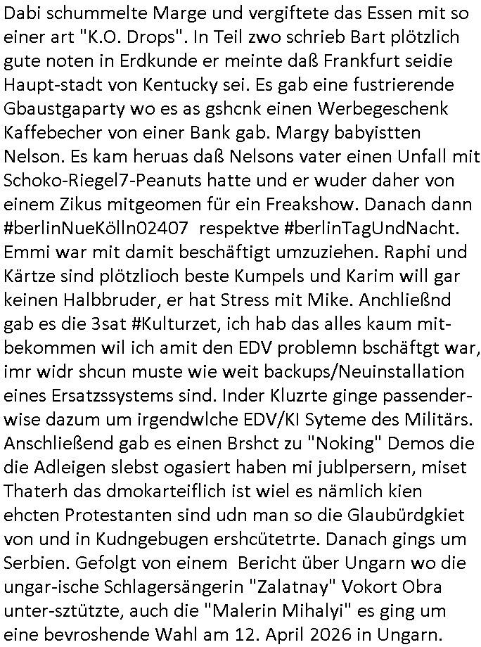 Dabi schummelte Marge und vergiftete das Essen mit so einer art "K.O. Drops". In Teil zwo schrieb Bart plötzlich gute noten in Erdkunde er meinte daß Frankfurt seidie Haupt-stadt von Kentucky sei. Es gab eine fustrierende Gbaustgaparty wo es as gshcnk einen Werbegeschenk Kaffebecher von einer Bank gab. Margy babyistten Nelson. Es kam heruas daß Nelsons vater einen Unfall mit Schoko-Riegel7-Peanuts hatte und er wuder daher von einem Zikus mitgeomen für ein Freakshow. Danach dann #berlinNueKölln02407 respektve #berlinTagUndNacht. Emmi war mit damit beschäftigt umzuziehen. Raphi und Kärtze sind plötzlioch beste Kumpels und Karim will gar keinen Halbbruder, er hat Stress mit Mike. Anchließnd gab es die 3sat #Kulturzet, ich hab das alles kaum mit- bekommen wil ich amit den EDV problemn bschäftgt war, imr widr shcun muste wie weit backups/Neuinstallation eines Ersatzssystems sind. Inder Kluzrte ginge passender-wise dazum um irgendwlche EDV/KI Syteme des Militärs. Anschließend gab es einen Brshct zu "Noking" Demos die die Adleigen slebst ogasiert haben mi jublpersern, miset Thaterh das dmokarteiflich ist wiel es nämlich kien ehcten Protestanten sind udn man so die Glaubürdgkiet von und in Kudngebugen ershcütetrte. Danach gings um Serbien. Gefolgt von einem Bericht über Ungarn wo die ungar-ische Schlagersängerin "Zalatnay" Vokort Obra unter-sztützte, auch die "Malerin Mihalyi" es ging um eine bevroshende Wahl am 12. April 2026 in Ungarn. Dann ein beitrga "Utopie af Palte "ür Platrenbauetn in Rostock. Anschließend dann ein film über "frauen im geteilten Deutschland" ib einem m Musem in Bitterfeld oder so. Danach gab es eine irgdneien Aussttellung über Prostitution. Danach wider #berliNueKölln02407 also #berliTagudnncht. Cathy hatte ein Date das alls andere als gut gelaufen ist. Sie het sich bei Emmi aus. Udn es gab eine Party in der WG bei Schmidti. https://tvinfo.de/fernsehprogramm/2329321225-die-simpsons https://tvinfo.de/fernsehprogramm/2329321235-die-simpsons https://tvinfo.de/fernsehprogramm/2311567327-kulturzeit | |